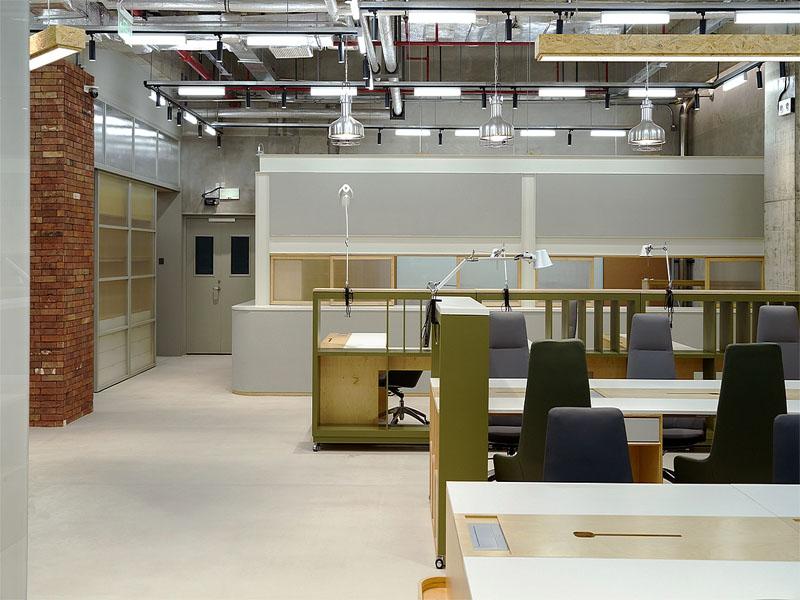 灯光设计上,天花板裸露的轨道灯与工业风吊灯,搭配可调节的工位台灯,构建了多层次的照明体系。白天,自然光透过长虹玻璃形成流动的光影,为空间注入温柔的氛围感;夜晚,轨道灯与台灯的组合则能精准适配不同场景的照明需求,让空间在不同时段拥有截然不同的情绪表达。