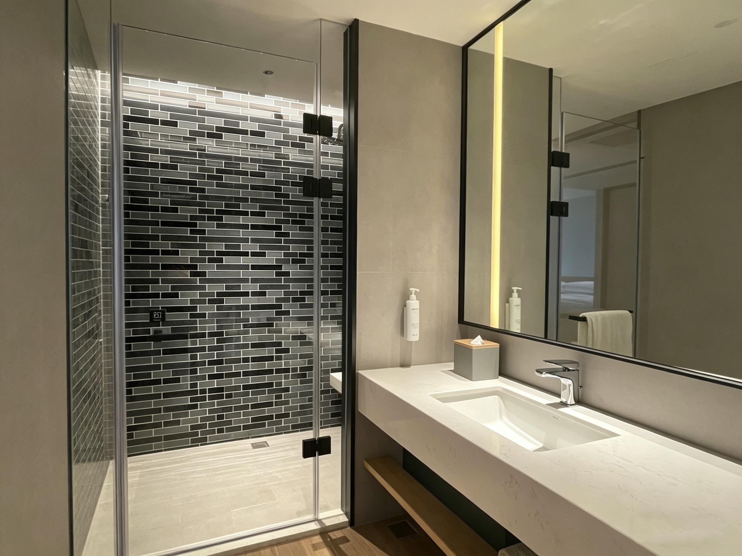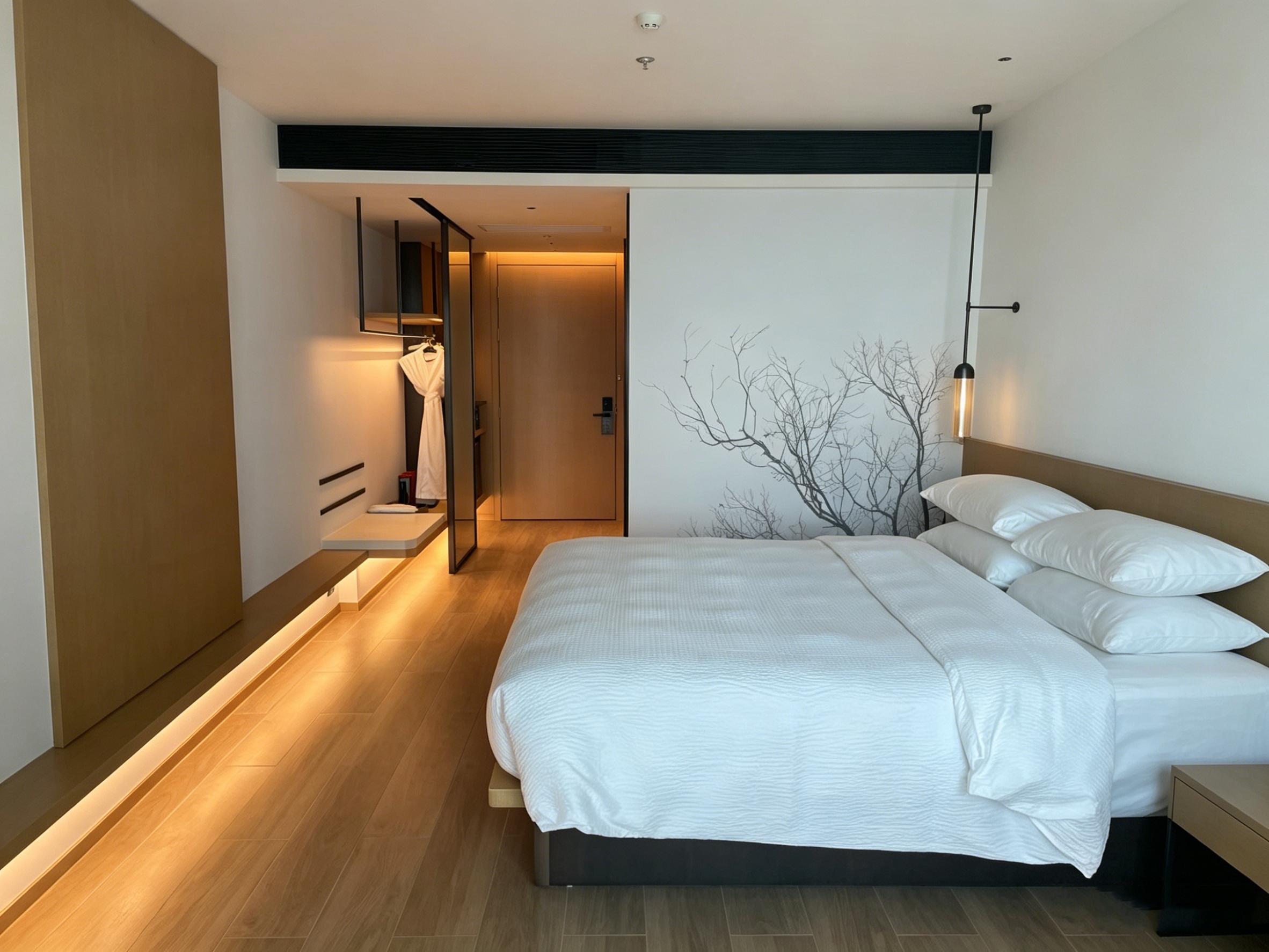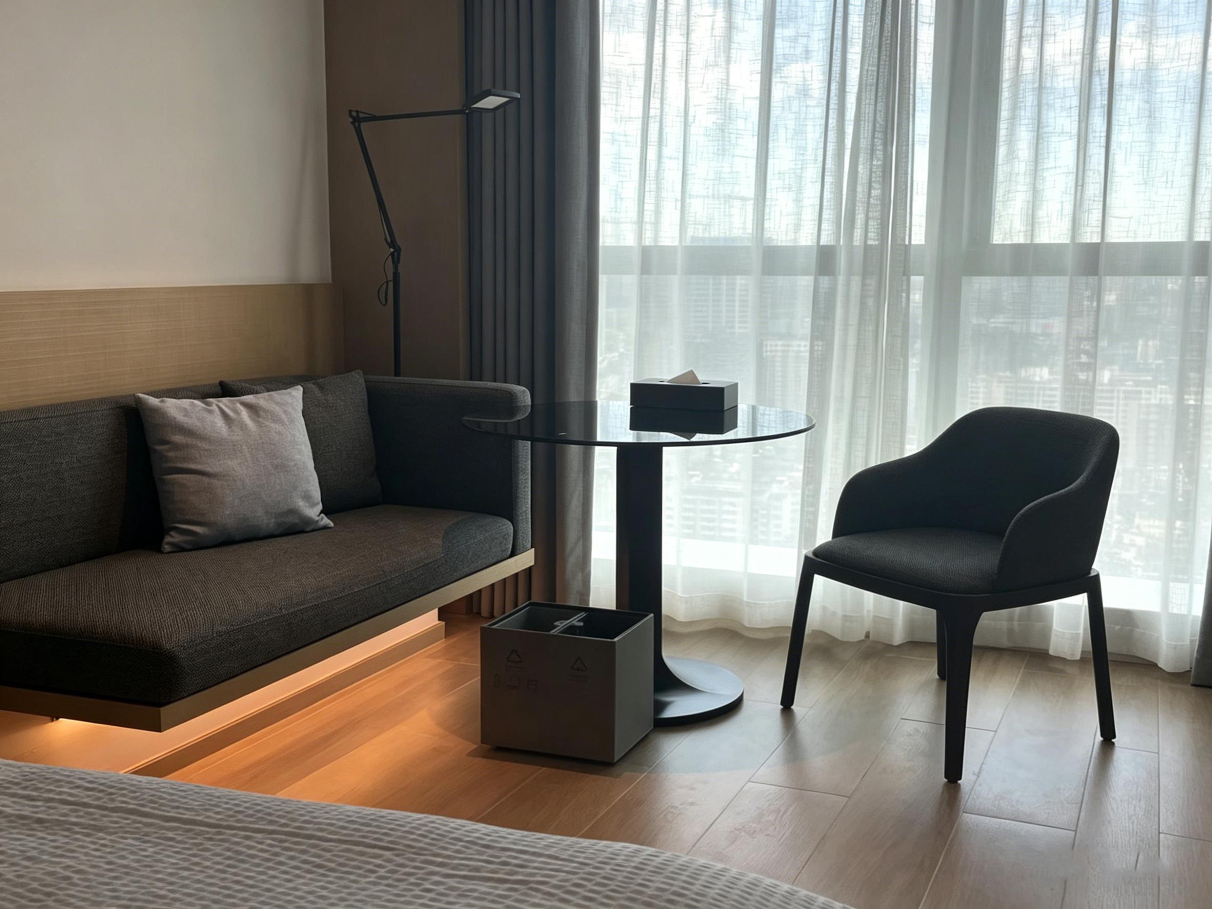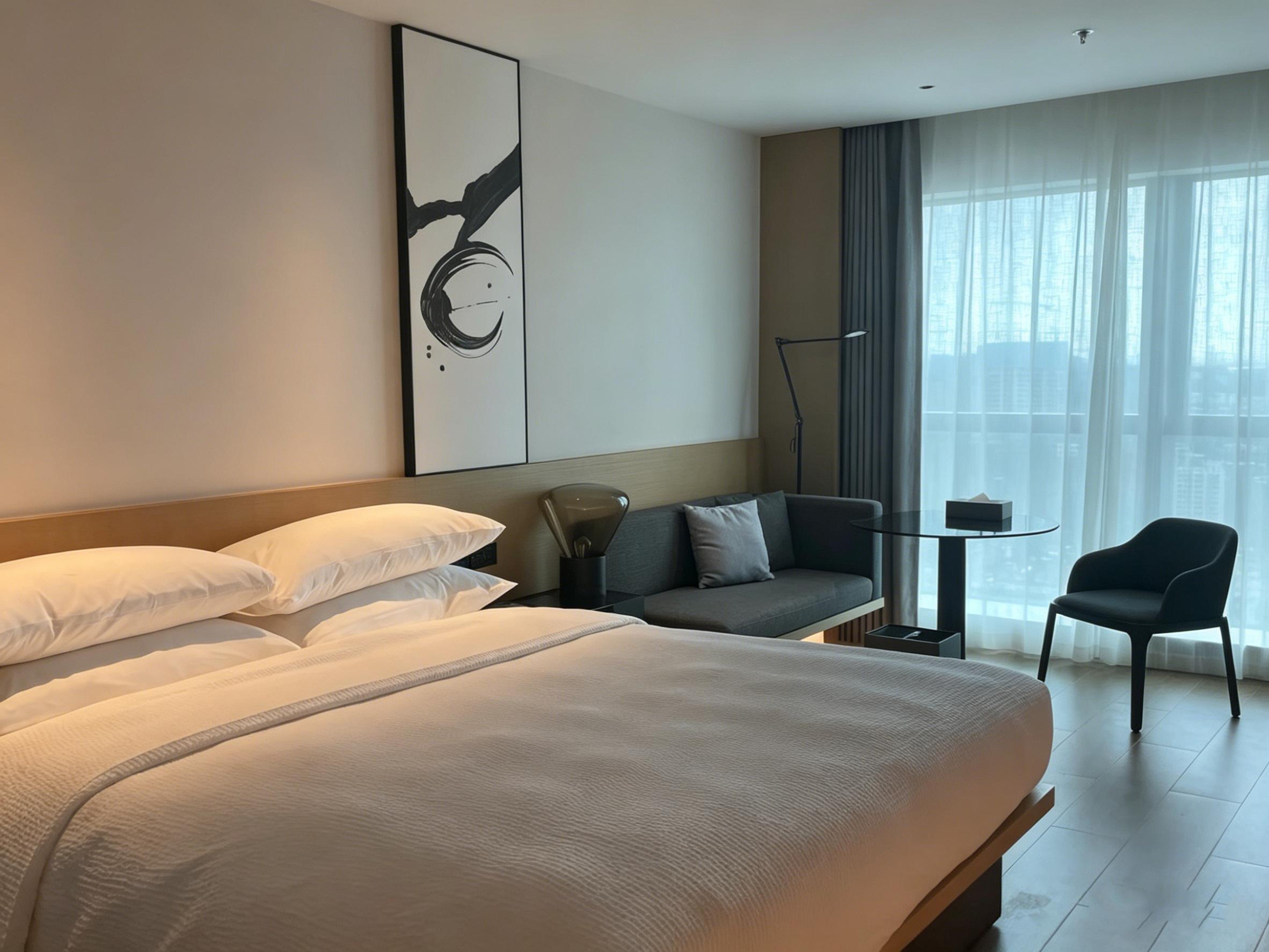 客房设计延续公区的极简基调,以温润的浅木色地板搭配低饱和灰调软装,打造静谧的居住氛围。靠窗区域设置休闲沙发与玻璃小圆桌,搭配落地纱帘,将城市景观引入室内,形成专属的观景休憩区;床头的黑白水墨装饰画,以写意笔触呼应成都的人文气质,为简洁空间增添了几分东方美学的韵味。卫浴区采用黑白马赛克墙砖与岩板台面,搭配玻璃隔断实现干湿分离,壁龛灯带与镜前灯的组合,兼顾实用性与设计感,细节处彰显品质。