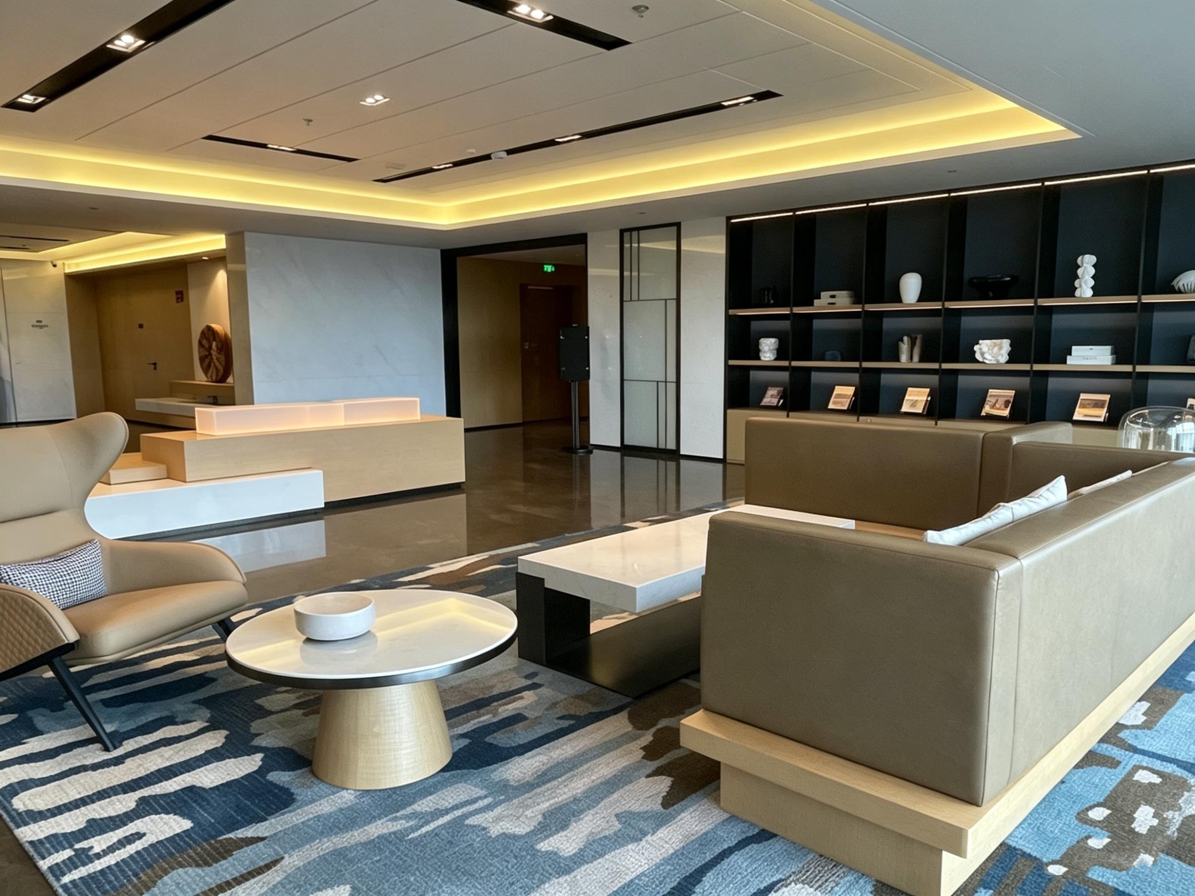 公区以浅木色、暖灰为基底,搭配线性灯带与无主灯设计,弱化厚重感的同时营造柔和氛围感。不可忽略的接待区采用米白大理石与原木矮台组合,搭配浅棕皮质沙发与艺术地毯,弱化了商务空间的距离感;增加了协调性,背景墙的开放式展示柜,通过黑白艺术摆件与书籍陈列,为公共区域注入雅致的细节质感,既满足接待需求,也成为客人短暂停留、放松交流的舒适角落。
