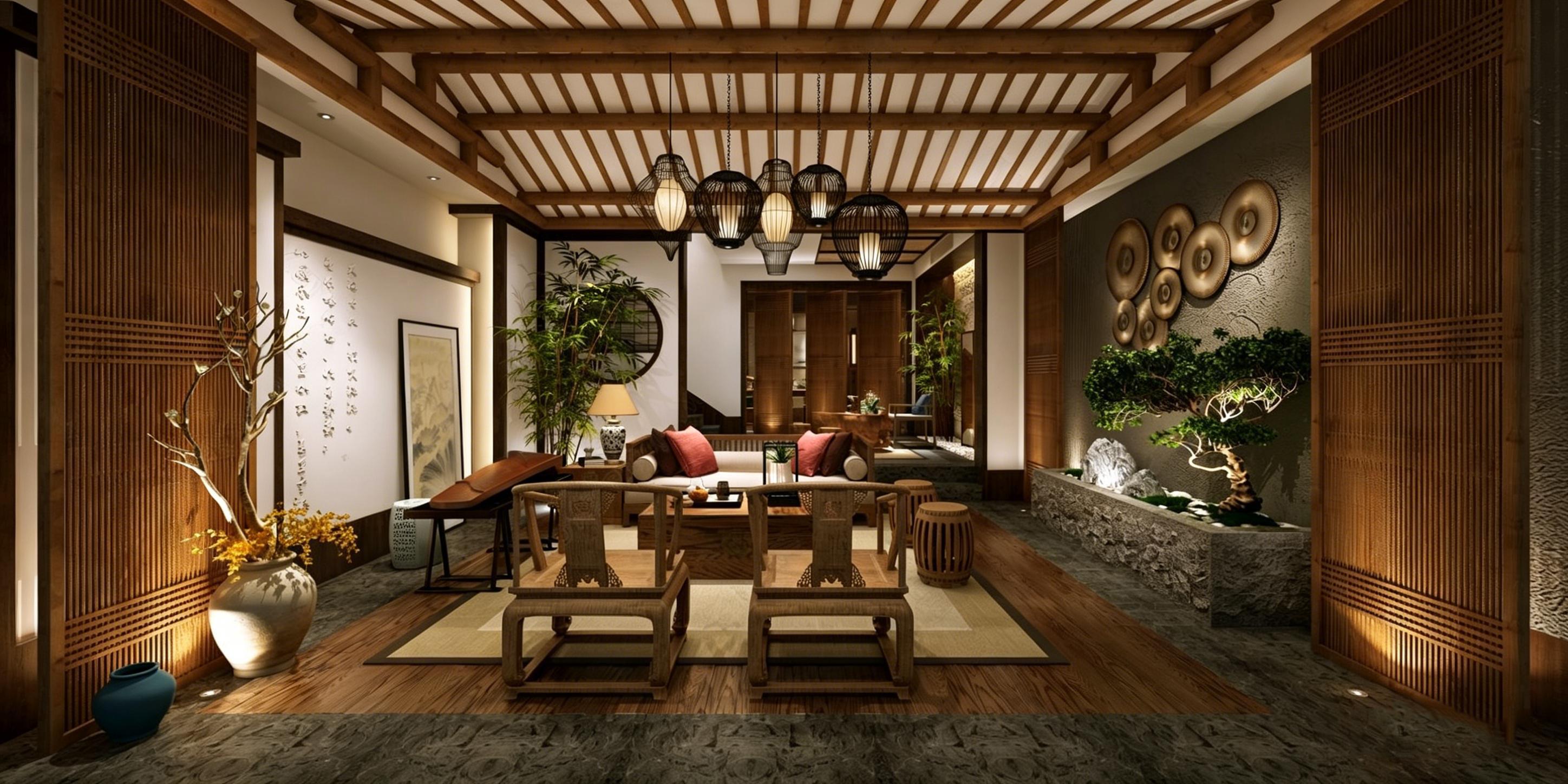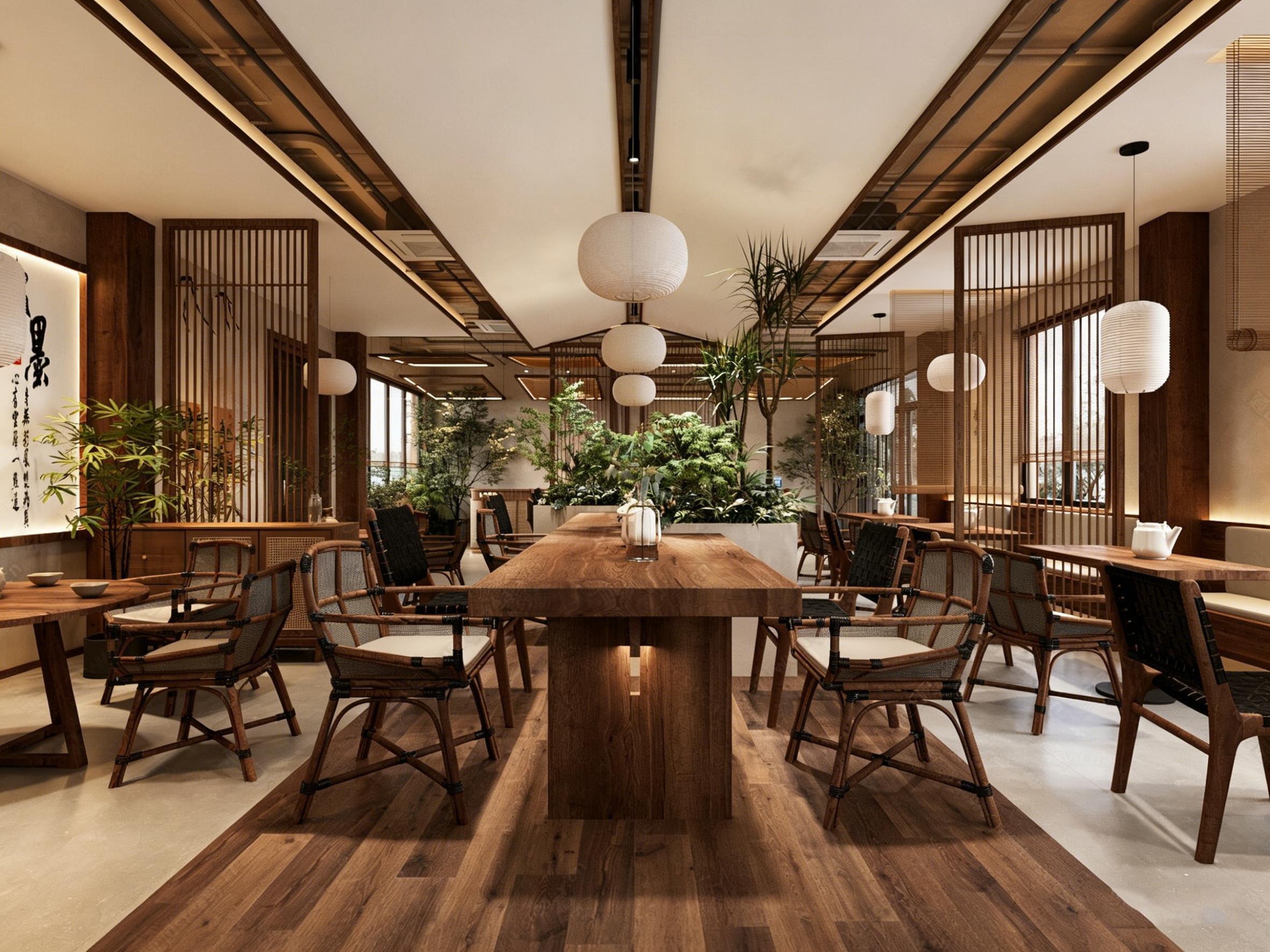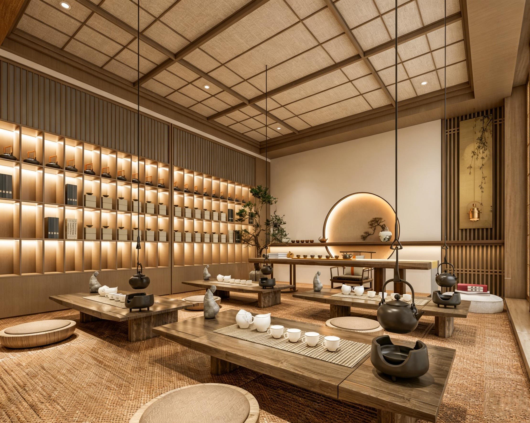 我们摒弃了传统中式的厚重繁复,以原木、藤编、竹格栅为核心材质,构建起温润自然的空间基底。大堂挑高的木质梁架复刻了古建的结构美学,搭配错落的灯笼吊灯,暖光漫过格栅缝隙,在地面投下温柔的光影,一进门便卸下外界的喧嚣。墙面的山水书法、造景盆景与石材肌理墙呼应,将 “移步换景” 的园林美学搬进室内,枯山水造景与禅意摆件,让每一处角落都自成风景。茶区以通透的布局打造多元场景,围坐式的榻榻米茶区,用编织地台与悬挂茶壶营造沉浸式围炉氛围;散座区的原木长桌搭配藤编座椅,半透的竹格栅既划分了空间,又保留了空气的流通感,让商务洽谈、好友小聚都能拥有舒适的距离感。吧台区域以深胡桃木打造,内嵌式灯带照亮茶具陈列区,藤编与发光软包的碰撞,兼顾了实用收纳与视觉质感,也成为了空间的点睛之笔。