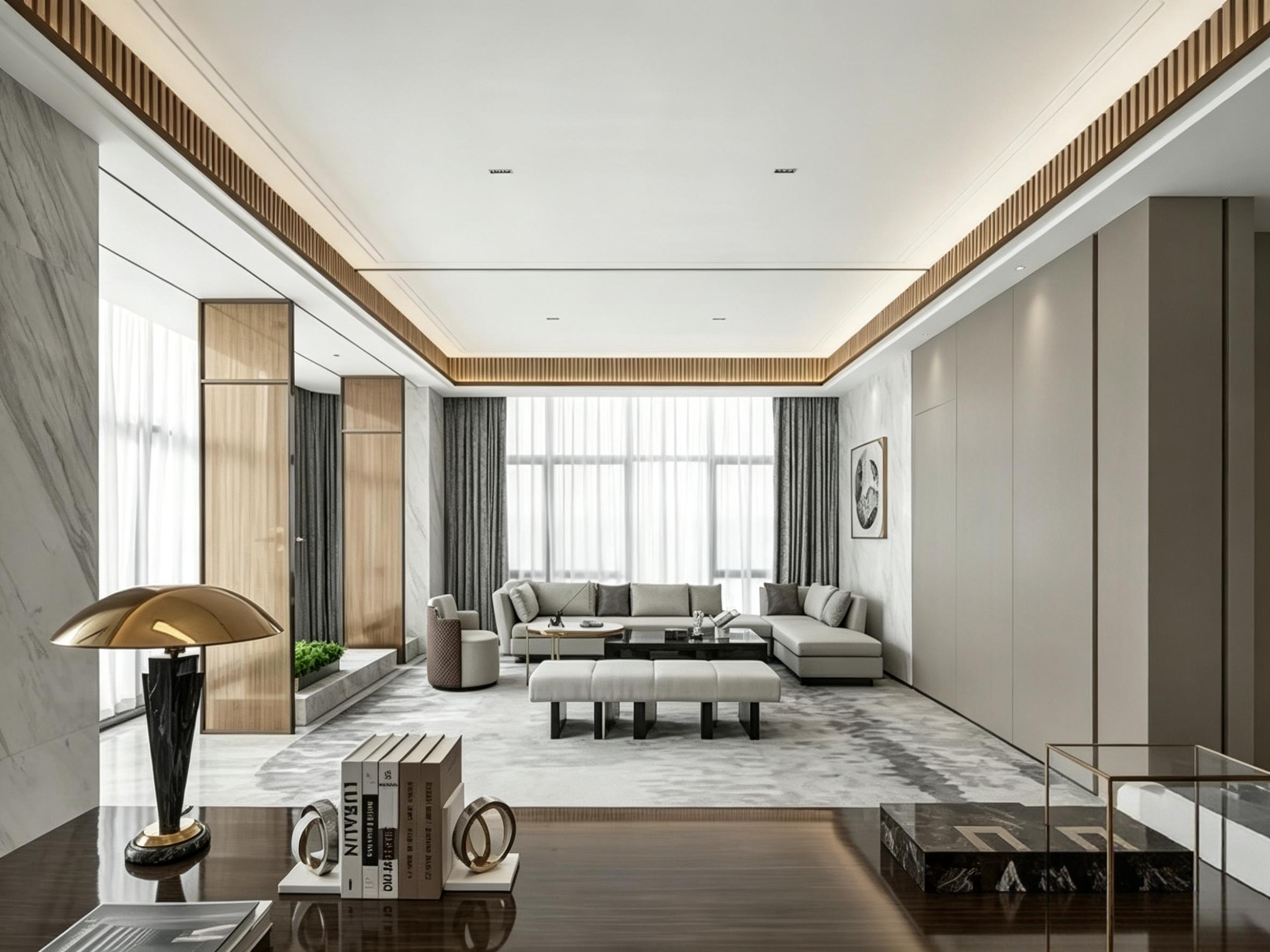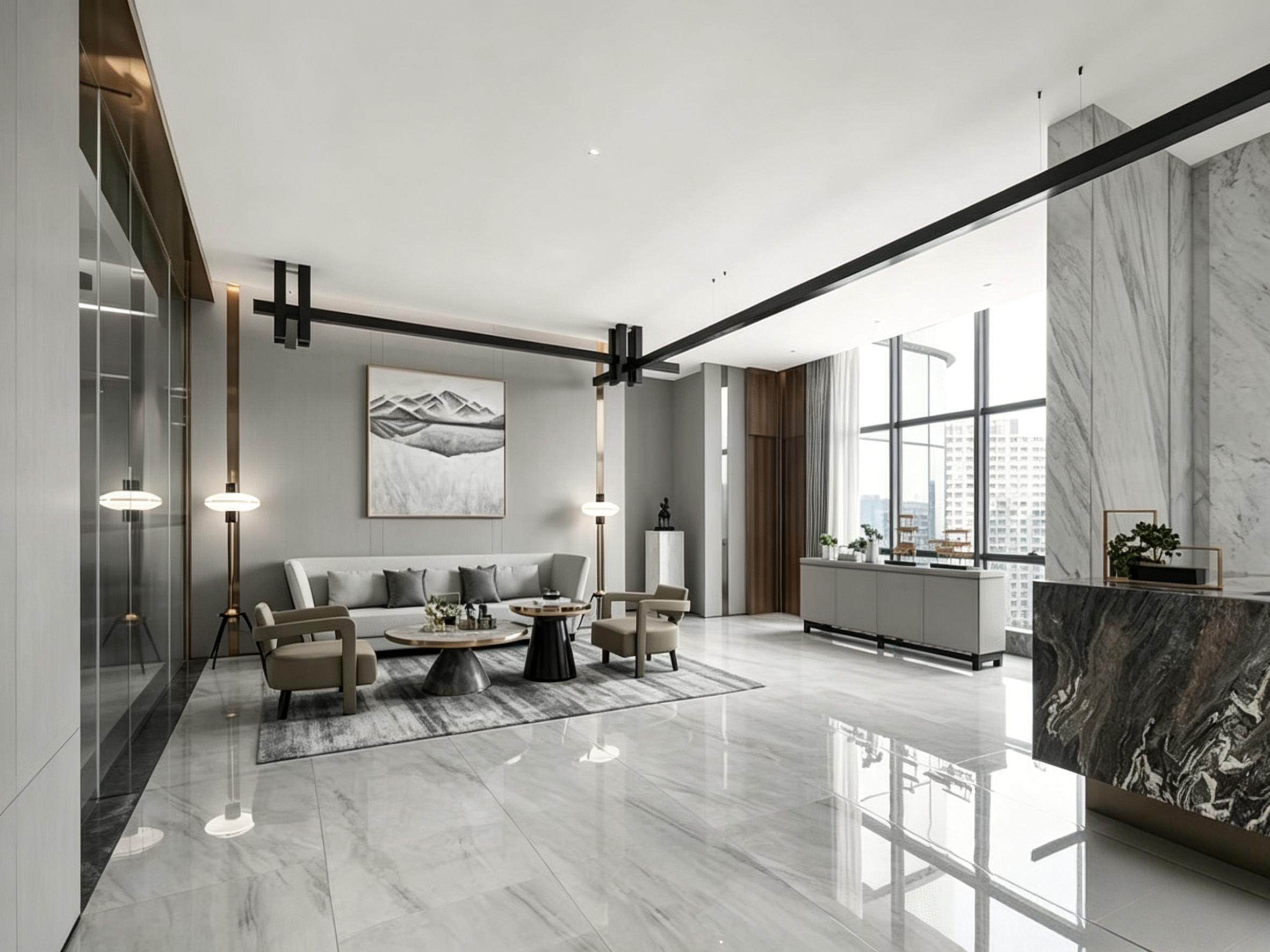 局部点缀金属质感的台灯、艺术摆件,搭配浅木色与深灰的软装,让空间层次丰富却不杂乱,适配商务接待、小型洽谈等多种场景,传递出沉稳专业的品牌气质。