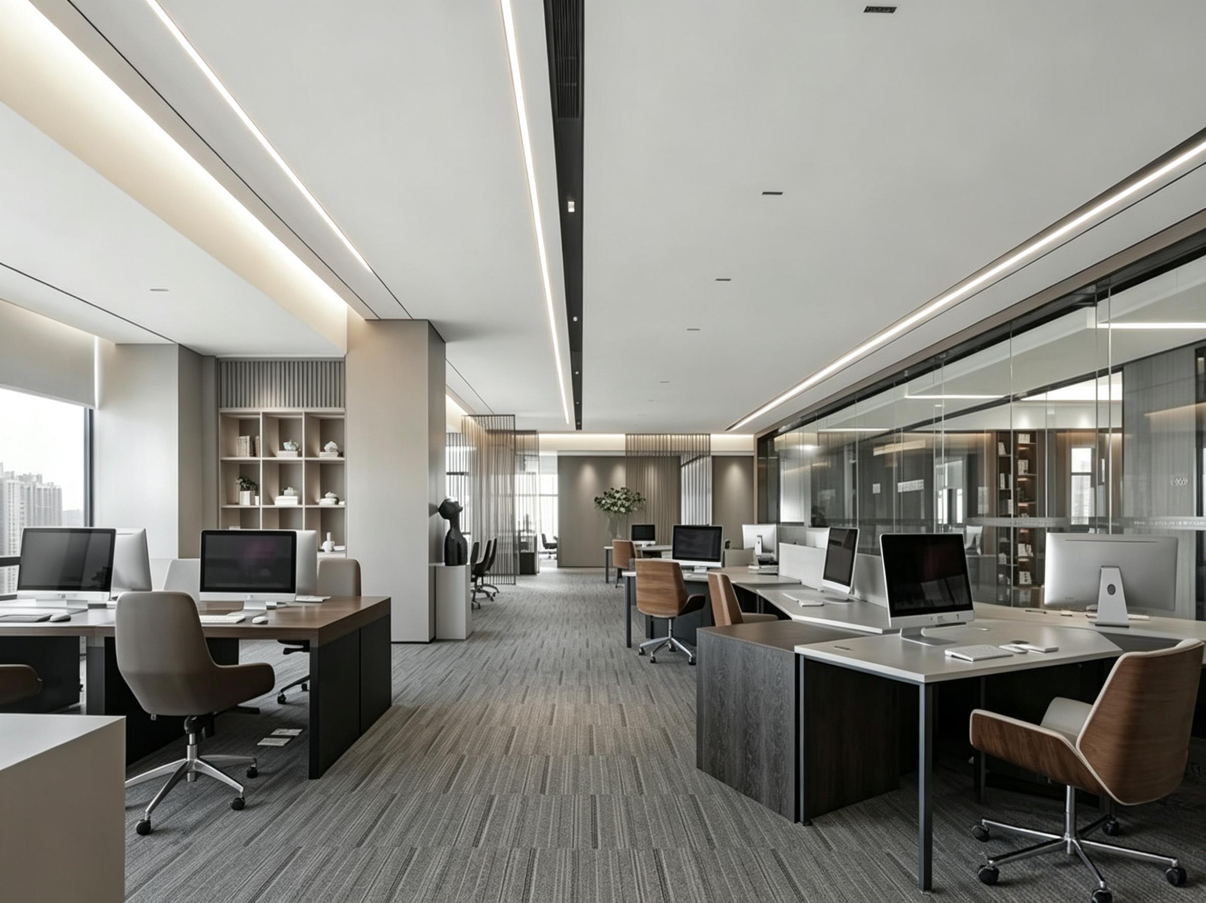 线性无主灯设计搭配局部筒灯,均匀的光线覆盖全区域,避免灯光死角,同时通过合理的工位排布,预留出宽敞的通行动线,让员工在高效办公的同时,也能感受到舒适的空间氛围。
