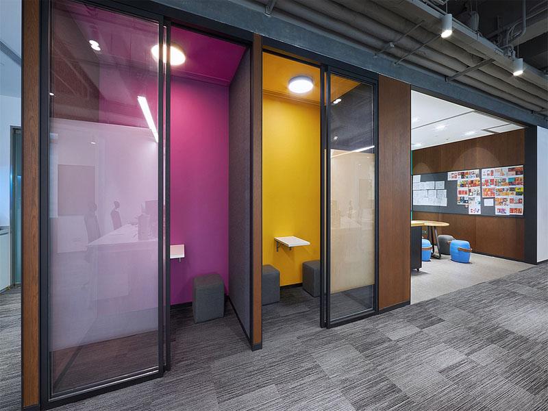 设计团队摒弃了传统封闭的办公格局,以通透感为核心,大面积采用玻璃隔断与落地窗,将城市天际线的自然光线引入室内,让空间在视觉上更显开阔明亮。同时,通过色彩心理学的巧妙运用,以活力黄、优雅紫、清新蓝等明快色调划分出不同功能区域:静谧的电话亭式独立隔间为员工提供了专注思考的角落,暖木色的开放式工位区则营造出轻松高效的协作氛围,明亮的会议区与休闲水吧则成为思想碰撞、团队凝聚的社交场域。