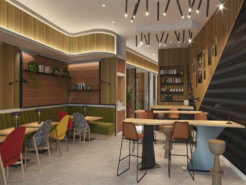 餐饮区的设计则打破了传统酒店餐厅的刻板印象,绿色软包卡座搭配彩色单椅,浅木餐桌与黑色金属支架形成材质碰撞,顶部错落的轨道灯为空间注入活力,墙面的木质格栅与置物架,既承担了收纳功能,也成为空间的装饰语言,让用餐场景兼具社交属性与舒适体验。