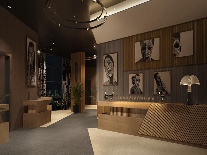 公区的设计是整个项目的点睛之笔。接待台以温润原木打造,斜向格栅肌理打破了传统前台的沉闷感,深浅木色的层次过渡,呼应着川西民居的质朴质感。墙面的非洲图腾艺术画,并非生硬的文化符号堆砌,而是与竖纹木格栅、肌理墙面形成对话,深色墙面与暖调灯光交织,在夜间勾勒出静谧又充满张力的氛围,窗外的城市夜景与室内的艺术装置相映,让等待也成了一种享受。休闲区的藤编吊灯、深色鱼骨木地板与彩色拼接地毯碰撞,通透的玻璃隔断模糊了空间边界,自然光穿过格纹玻璃,在墙面投下流动的光影,竹编座椅与绿植点缀其间,营造出松弛治愈的休憩氛围。