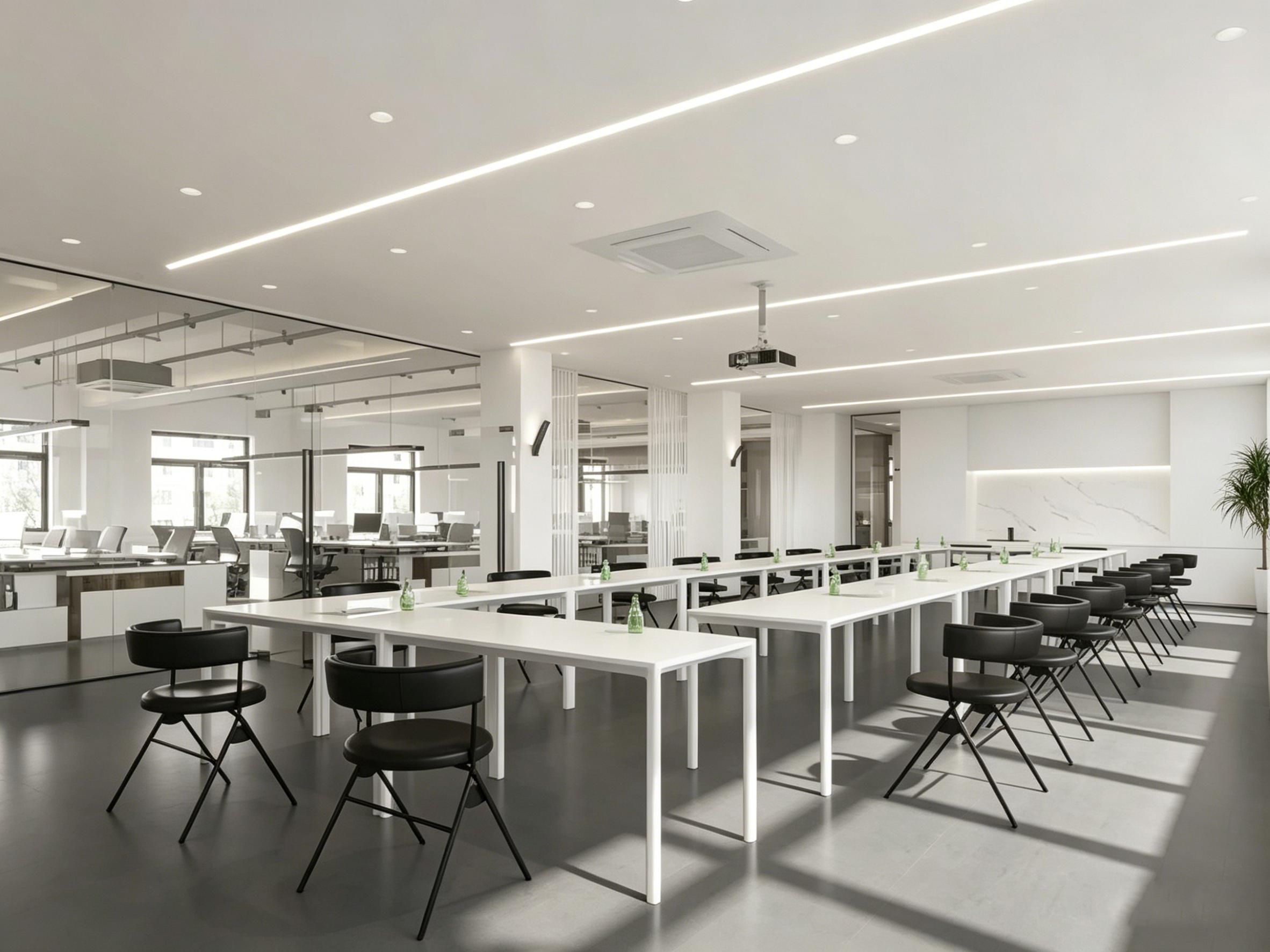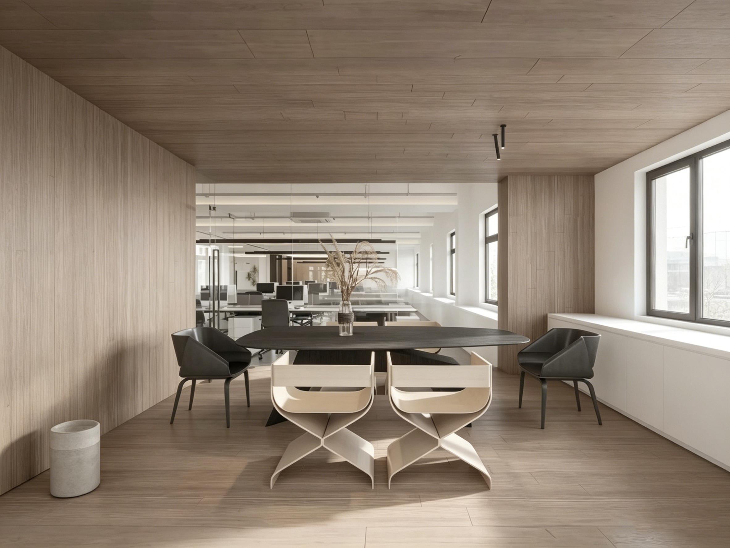 会议空间与洽谈区延续了整体的极简风格,大面积木饰面吊顶与墙面,搭配低饱和度的家具,营造出沉稳又松弛的沟通氛围。培训室采用通顶玻璃与线性照明,打造兼具展示与会议功能的复合空间,可灵活适配不同规模的团队交流场景;休闲洽谈区则以软质沙发与自然绿植,为员工提供放松的社交角落,平衡工作与生活的边界。