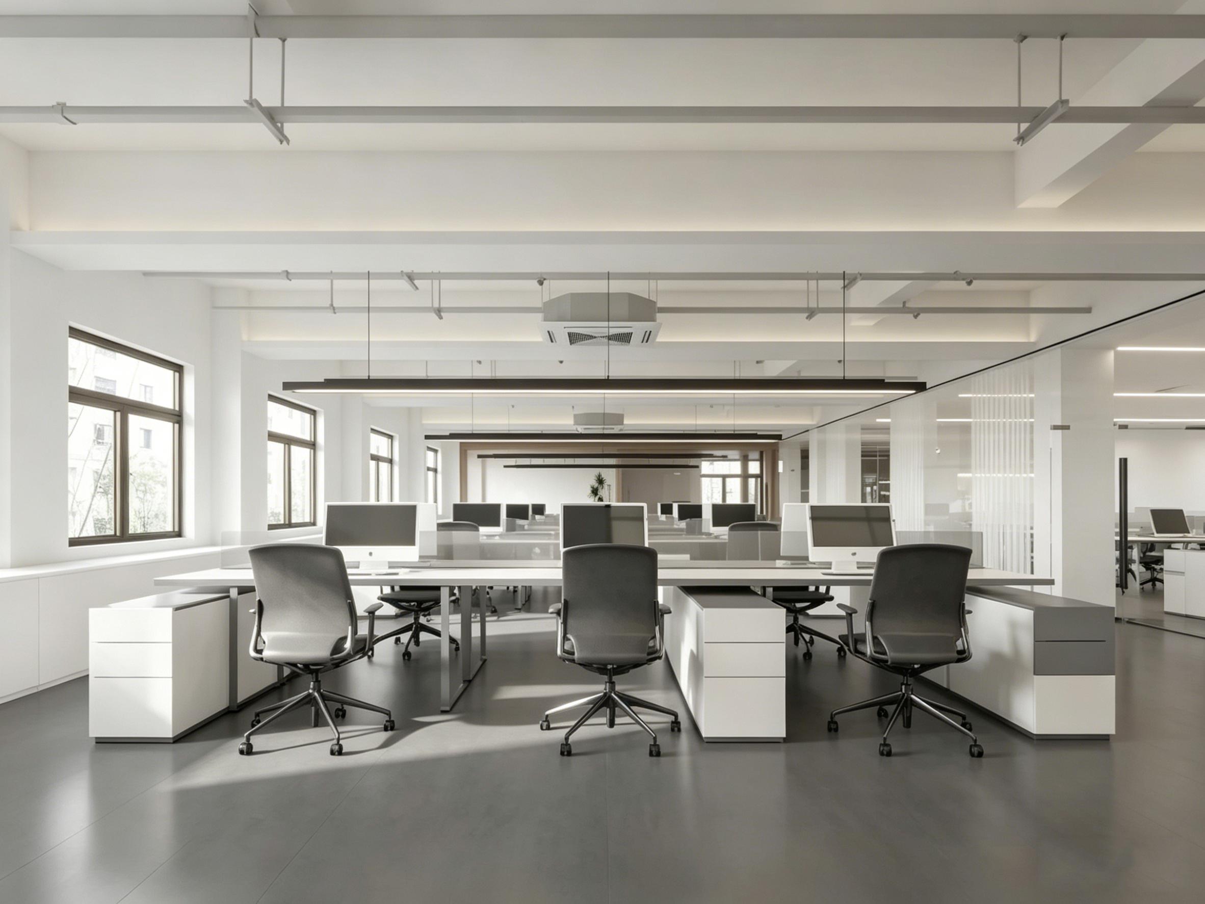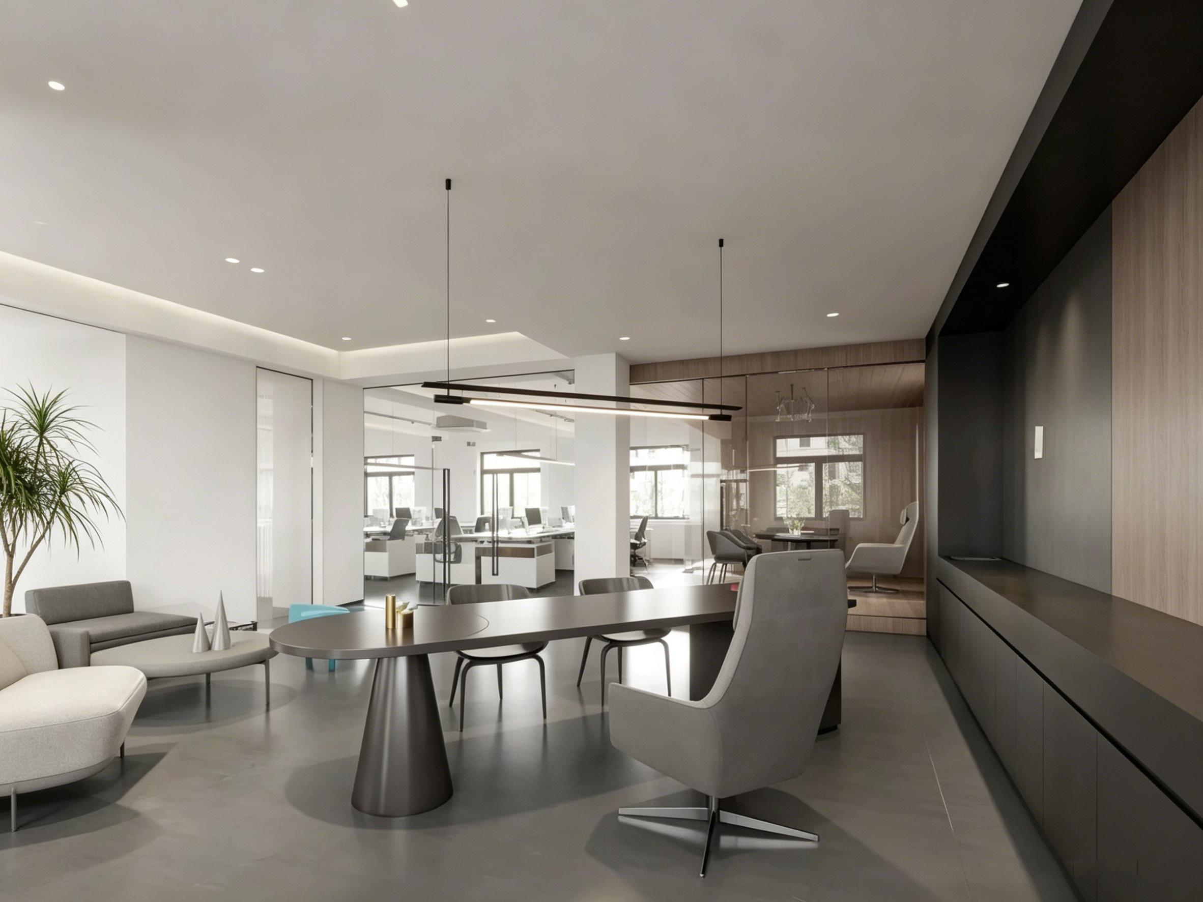 开放办公区以大面积浅灰地坪搭配纯白线性灯,打造通透明亮的主基调,模块化工位与玻璃隔断的组合,既保障了员工高效协作的动线,又通过无遮挡的采光设计,让自然光穿透整个空间,消解了传统办公的压抑感。木饰面的温润质感穿插其中,在冷调的现代材质中注入柔和温度,打破黑白灰的单调,构建起 “专业不冰冷” 的办公氛围。