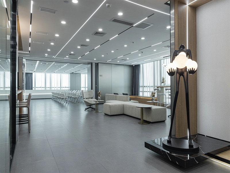 在细节处理上,项目充分体现了对员工的人文关怀:线性灯带与嵌入式筒灯的组合照明,既满足了不同场景的办公照明需求,又避免了强光直射带来的视觉疲劳;高背办公椅与人体工学沙发的选用,为长时间工作或休憩的员工提供了舒适支撑;水吧区的开放式储物设计与便捷操作台面,让员工的日常休憩与团队轻社交变得自然顺畅;公共区域的艺术装置与绿植点缀,则在极简底色中注入了生机与温度,缓解了工作带来的疲惫感。