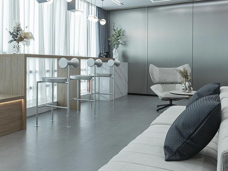设计团队以低饱和灰、米白为空间主色调,搭配浅木色与金属线条作为点缀,在视觉上营造出冷静专业、干净通透的氛围。大面积的玻璃隔断与无遮挡动线设计,既清晰划分了会议区、休闲区、水吧区与独立办公区等功能模块,又让自然光线在空间中自由流动,最大程度消解了传统封闭办公的压抑感。规整大气的会议室以纯白会议桌与线性灯带打造专业感,舒适松弛的休闲区则用软包沙发与艺术装置传递温度,功能齐全的水吧区以开放式吧台满足日常休憩需求,静谧雅致的独立办公室则兼顾私密性与采光,每个场景都在极简框架下实现了功能与美学的平衡。