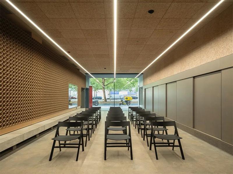 公装装修的细节里,藏着壹西格玛对办公场景的深度理解。墙面的竖向木饰面板不仅是装饰,更是隐藏式收纳系统的载体,统一的浅色调让整面墙形成秩序感,也避免了杂物堆积带来的杂乱。地面采用微水泥材质,易清洁且质感细腻,与混凝土立柱呼应,打造出统一的空间基底。而在会议与共享区域,穿孔吸音墙面与线性灯光的组合,既解决了公共空间的噪音问题,也通过简洁的线条感营造出专注的氛围,满足了成都本地团队对高效沟通与灵活办公的双重需求。
