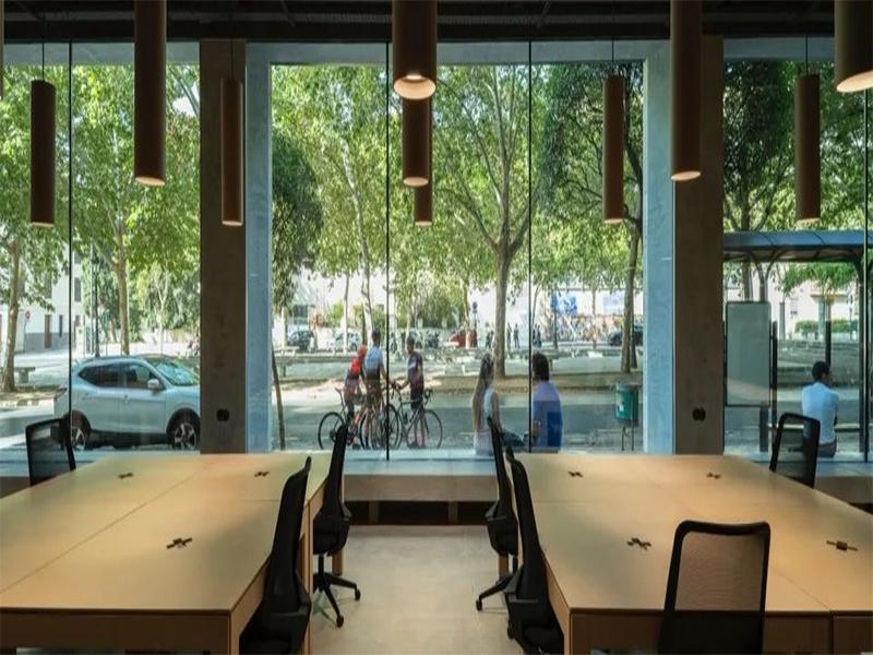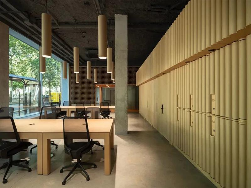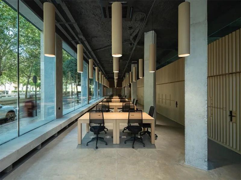 这处空间的核心亮点,是对“自然光与公共性”的极致利用。整面落地玻璃打破了室内外的边界,街道的绿树与光影被引入室内,消解了传统办公室的封闭感。壹西格玛的设计团队在公装装修中,特意将开放工位沿窗排布,搭配浅原木色的长桌与黑色网布办公椅,既保证了工位的通透采光,也让团队协作的动线更流畅。顶部裸露的水泥天花搭配同色系的圆柱吊灯,中和了原木的软,让空间在温润中保留了工业风的利落,这正是成都办公室设计中,对“松弛与专业平衡”的精准把控。