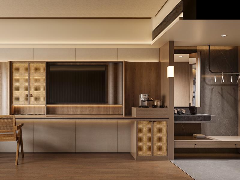 电视背景墙采用 “木格栅 + 藤编玻璃柜 + 哑光白墙板” 的一体化设计,内嵌氛围灯带,隐藏式收纳让墙面更整洁,也满足了 mini 吧、储物等功能需求。半开放式洗手台通过木质隔断实现干湿分区,既保证了隐私,又不会让空间显得压抑。双床房则采用对称式布局,延续了大床房的设计语言,同时增设内嵌式布艺沙发,适配双人入住的互动需求,兼顾了风格统一与功能适配。
