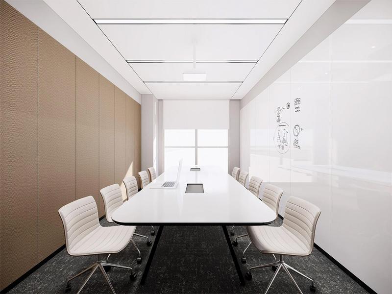 会议室采用简洁利落的长桌布局,一侧软包墙面提升空间质感,另一侧玻璃白板兼顾了会议记录与创意研讨需求。无主灯设计搭配嵌入式轨道灯,保证了均匀充足的照明,为团队头脑风暴与正式会议提供了专业、专注的环境。