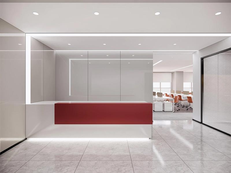 前台接待区以红白撞色设计打造视觉焦点,大理石地面与玻璃隔断延伸了空间感,背景墙的线性灯带烘托出简约大气的企业形象。透过玻璃隔断,可直接看到后方开放工位区,整体空间动线清晰,功能分区明确,充分展现了成都办公室装修的人性化与专业化。