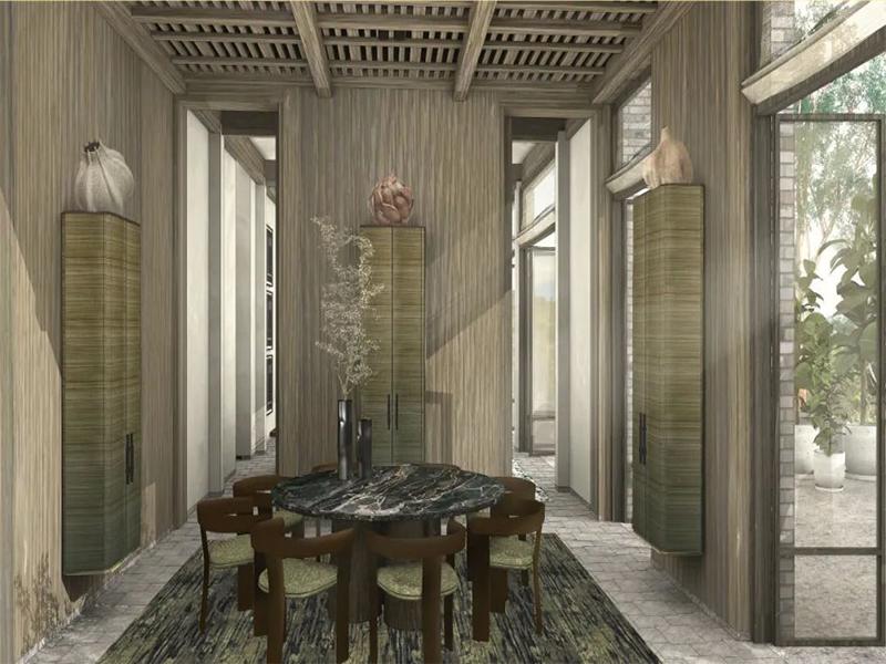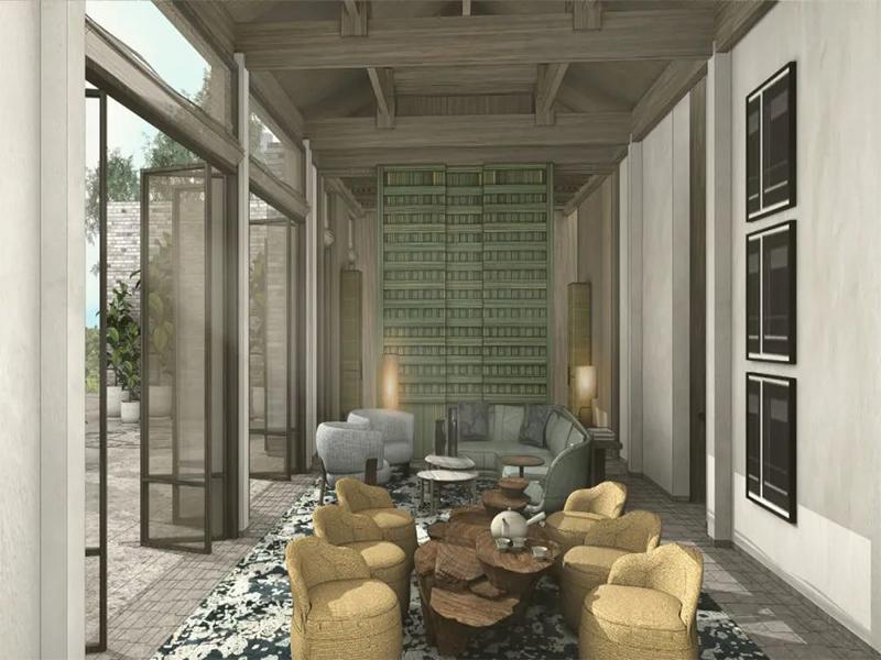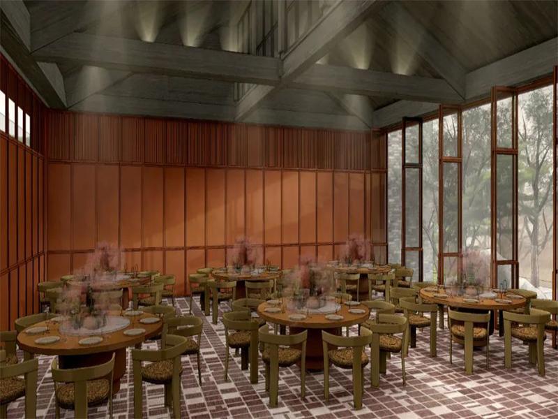 公装装修的巧思,更藏在餐厅与公区的细节里。中餐厅采用暖棕木饰面与坡形屋顶设计,红棕地砖与温润木椅搭配,大圆桌的布局适配多人用餐场景,落地玻璃窗将室外的林木光影引入室内,让用餐空间既有烟火气,又不失雅致格调。公区的茶歇空间则以原木为主要材质,不规则木茶几搭配米黄软椅,墨绿的整面书柜成为视觉焦点,搭配斑驳光影与复古地毯,打造出可供住客闲坐、交谈的松弛角落,让公装空间不再是功能的附属,而是传递酒店温度的载体。