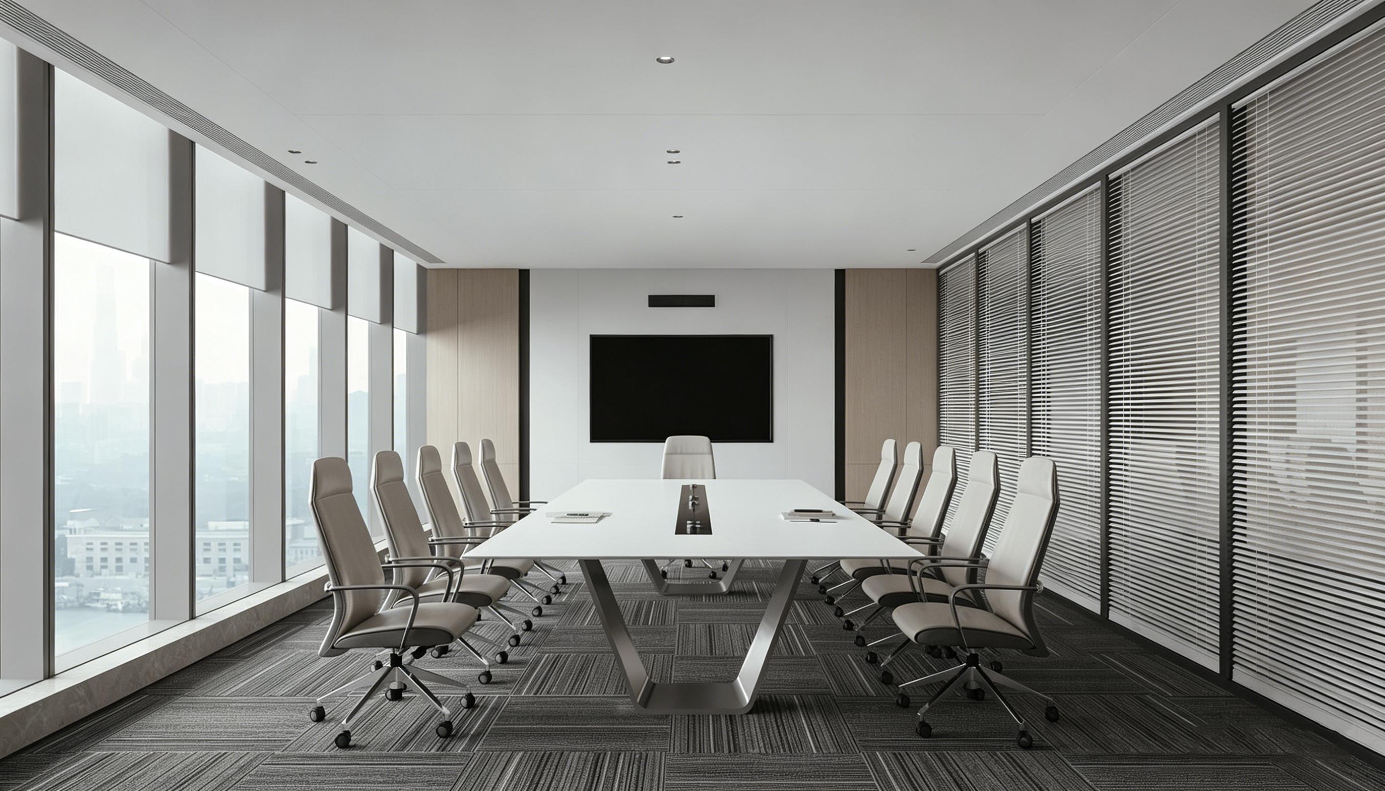 会议空间则以 “专业沉稳” 为基调,大面积玻璃隔断与百叶帘实现了采光与隐私的平衡,整面落地窗带来的开阔视野,让严肃的会议场景也能拥有放松的氛围。白色会议桌搭配高背办公椅,搭配隐藏式投影设备与音响系统,兼顾了日常沟通与大型会议的需求,为企业商务洽谈、团队研讨提供了专业可靠的场景支撑。