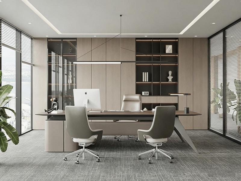 独立办公室的设计则兼顾了 “商务感与松弛感”,浅木色护墙板搭配玻璃展示柜,暗藏灯带让收纳区兼具展示性与实用性。大面积落地窗搭配绿植点缀,在保证私密办公的同时,为空间注入自然生机。简约的大班台搭配舒适的洽谈椅,既满足了日常办公需求,也为一对一沟通提供了轻松的氛围,实现了商务与温度的平衡。