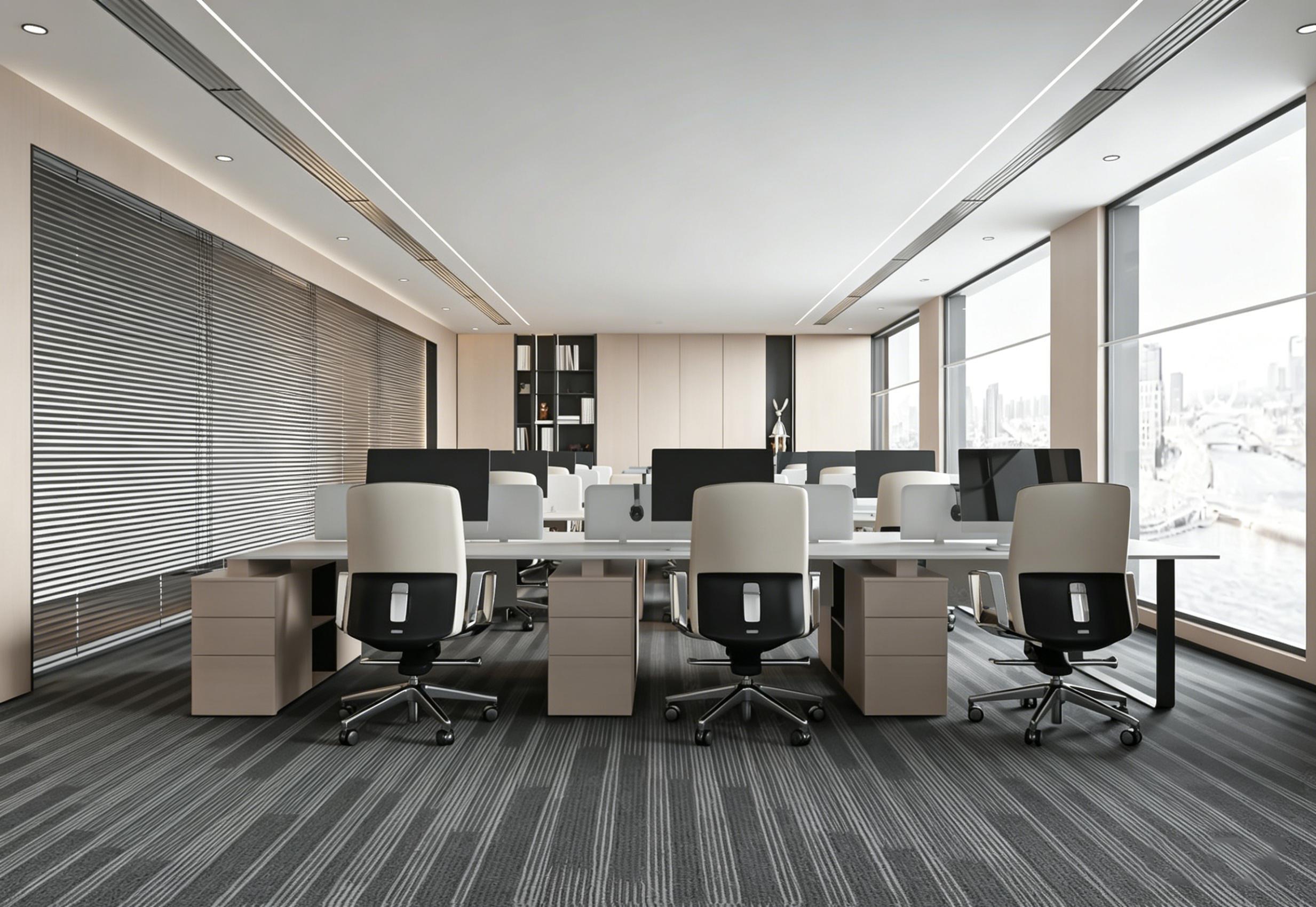 开放办公区以 “通透高效” 为设计核心,整面落地窗引入充足自然光,搭配浅木色饰面板与百叶帘,在保证隐私的同时,让空间时刻保持明亮柔和的氛围。模块化工位搭配静音地毯,既满足了团队协作的高效需求,也有效降低了办公噪音干扰。无主灯设计的线性灯与筒灯组合,均匀照亮整个工区,避免了光线死角,让员工在舒适的环境中保持专注,大幅提升团队协作效率。