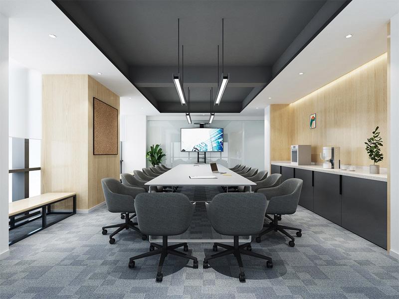 在会议室的设计中,我们打破传统严肃刻板的印象,通过深灰与原木的碰撞、线性灯光的有序排布,营造出高效且沉稳的交流氛围。浅灰地毯弱化了空间的冷硬感,侧边茶水台的设计则兼顾了会议中的便捷需求,让团队沟通更顺畅自然,这正是成都办公室设计中“功能优先,质感为辅”的体现。