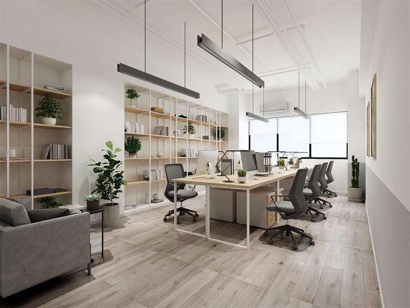 开放办公区则以明亮通透为基调,浅木色地板与白色墙面延伸了空间视觉,定制的开放式书架与绿植点缀,在满足收纳需求的同时,也为员工打造了轻松舒适的工作场景。简约的吊装灯具搭配线条利落的办公桌椅,既保证了充足的照明,也让整个区域充满现代感与秩序感,适配团队协作与专注办公的双重需求。