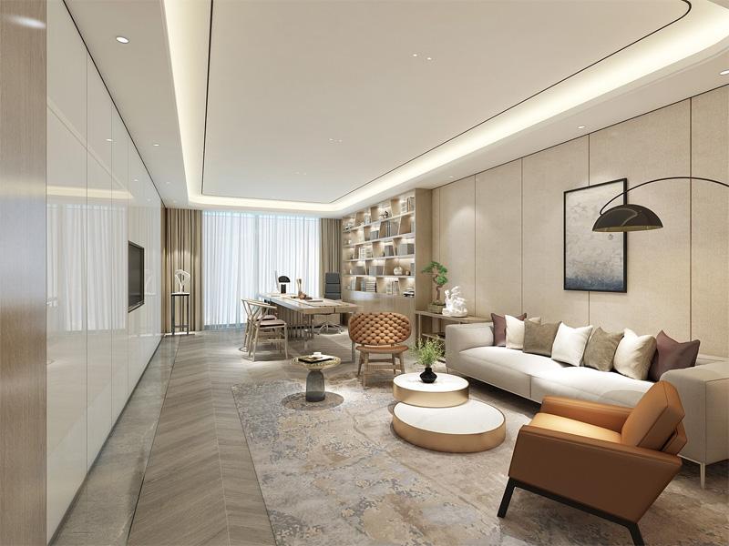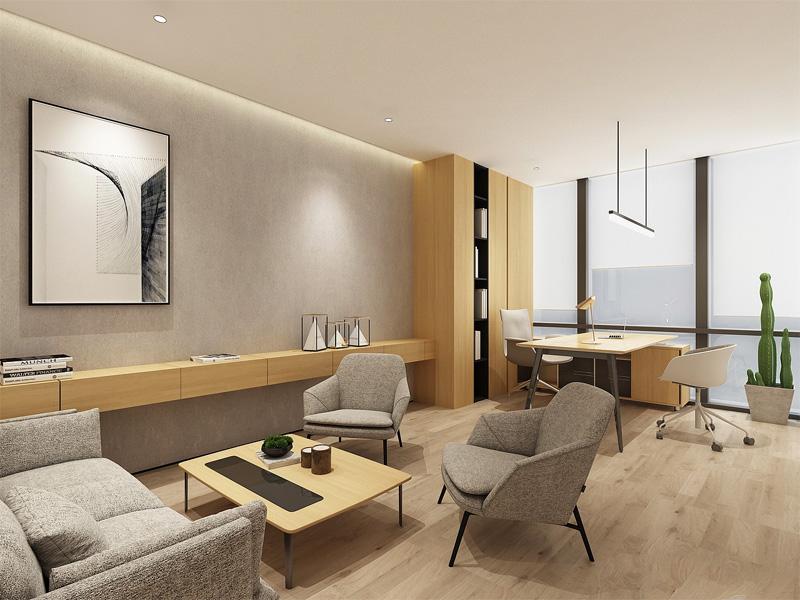独立办公区与接待区的设计,更注重私密感与格调的平衡。温润的木饰面搭配柔和的线性灯带,浅灰色软包家具传递出松弛而专业的氛围,大幅落地窗引入充足自然光,让办公与接待场景兼具温度与质感。