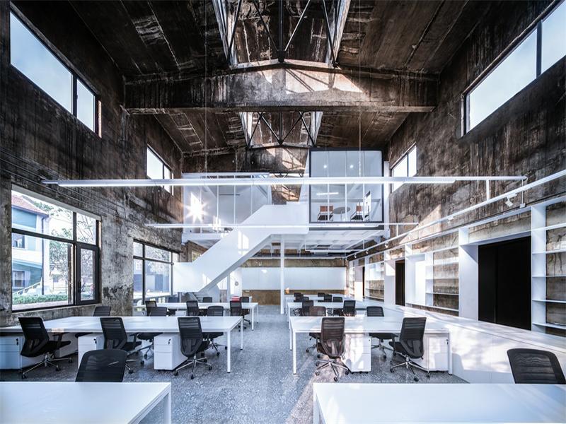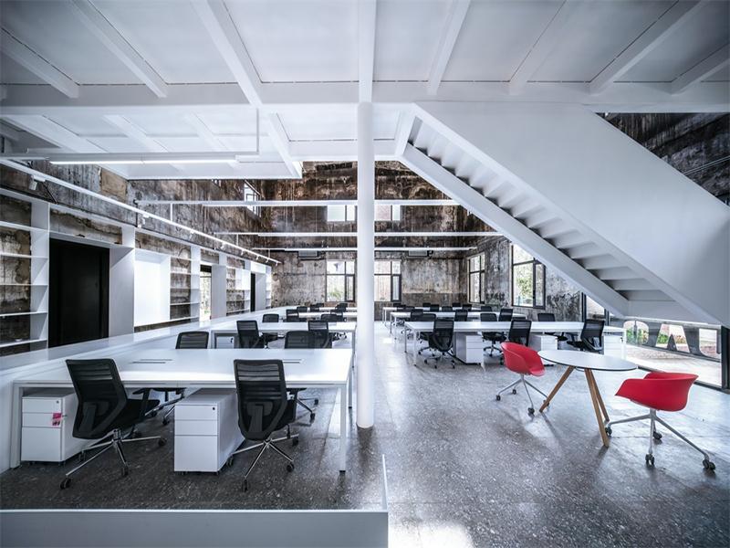 本次改造整体以原始工业风为设计主线,科学划分开放员工办公区、夹层会议办公区、休闲洽谈社交区三大功能分区,通过原始混凝土顶面、白色钢结构楼梯、极简白办公家具的碰撞,在保留旧厂房历史质感的同时,解决采光不足、动线混乱、隔音差等行业痛点,完全适配创意团队的办公与协作需求。