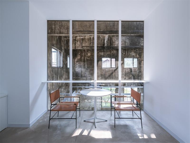 休闲洽谈社交区以极简白圆形桌椅搭配休闲座椅,为员工提供放松交流的专属场景;大面积玻璃墙面引入自然光线,与原始厂房的粗犷肌理形成对比,打造出松弛舒适的交流氛围,有效缓解工作压力,提升团队协作活力。