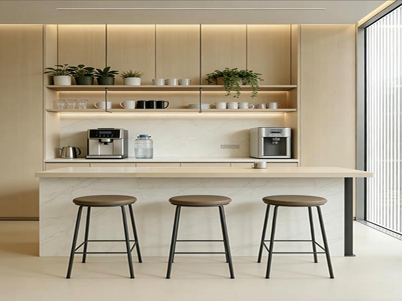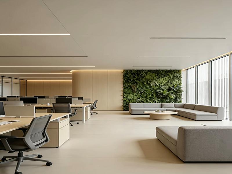 我们深知,好的办公空间不仅要好看,更要好用。接待区的大理石前台搭配木格栅背景,以温润的姿态迎接每一位访客;开放办公区的浅木色工位整齐排布,搭配顶部的线性灯,为团队协作打造高效有序的节奏;休闲区的绿植墙与浅灰色沙发,为忙碌的工作留出一处松弛的角落;茶水间的原木吧台与收纳系统,把日常的片刻休憩也变成一种享受。从会议桌的弧度,到灯光的色温,每一处细节都在平衡专业感与舒适度,让成都的打工人在高效工作的同时,也能感受到空间的温柔。