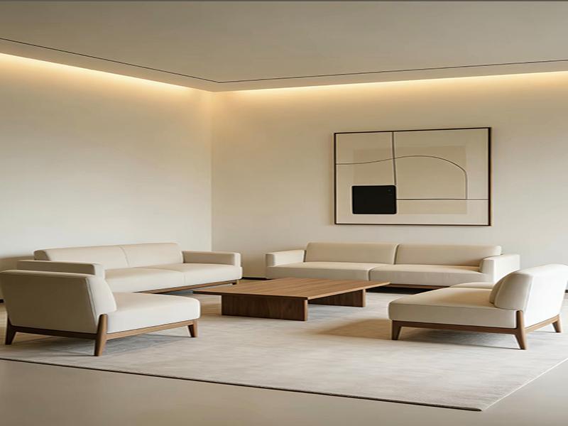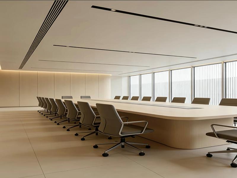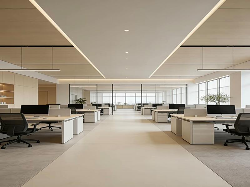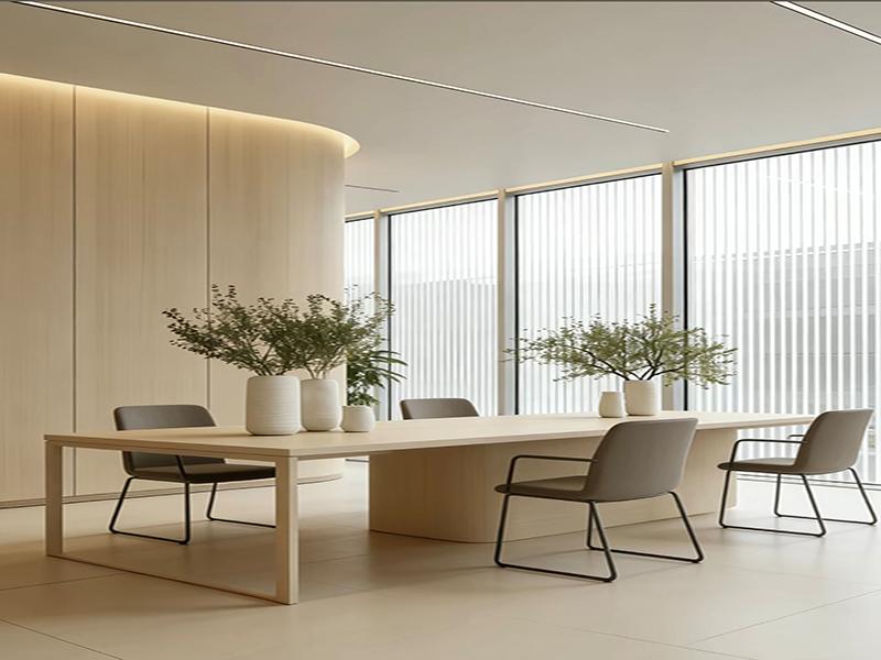 厂房改造最大的优势,是自带的开阔无柱空间。我们以极简主义为设计语言,用柔和的米白与原木色铺陈基底,搭配利落的线性灯与无主灯设计,弱化空间的冷硬感,让原本空旷的厂房变得通透又富有层次。大面积的玻璃隔断划分出开放工位、会议室与洽谈区,既保证了功能分区的秩序感,也让自然光可以毫无阻碍地洒满整个空间,完美适配成都企业对高效办公的需求。