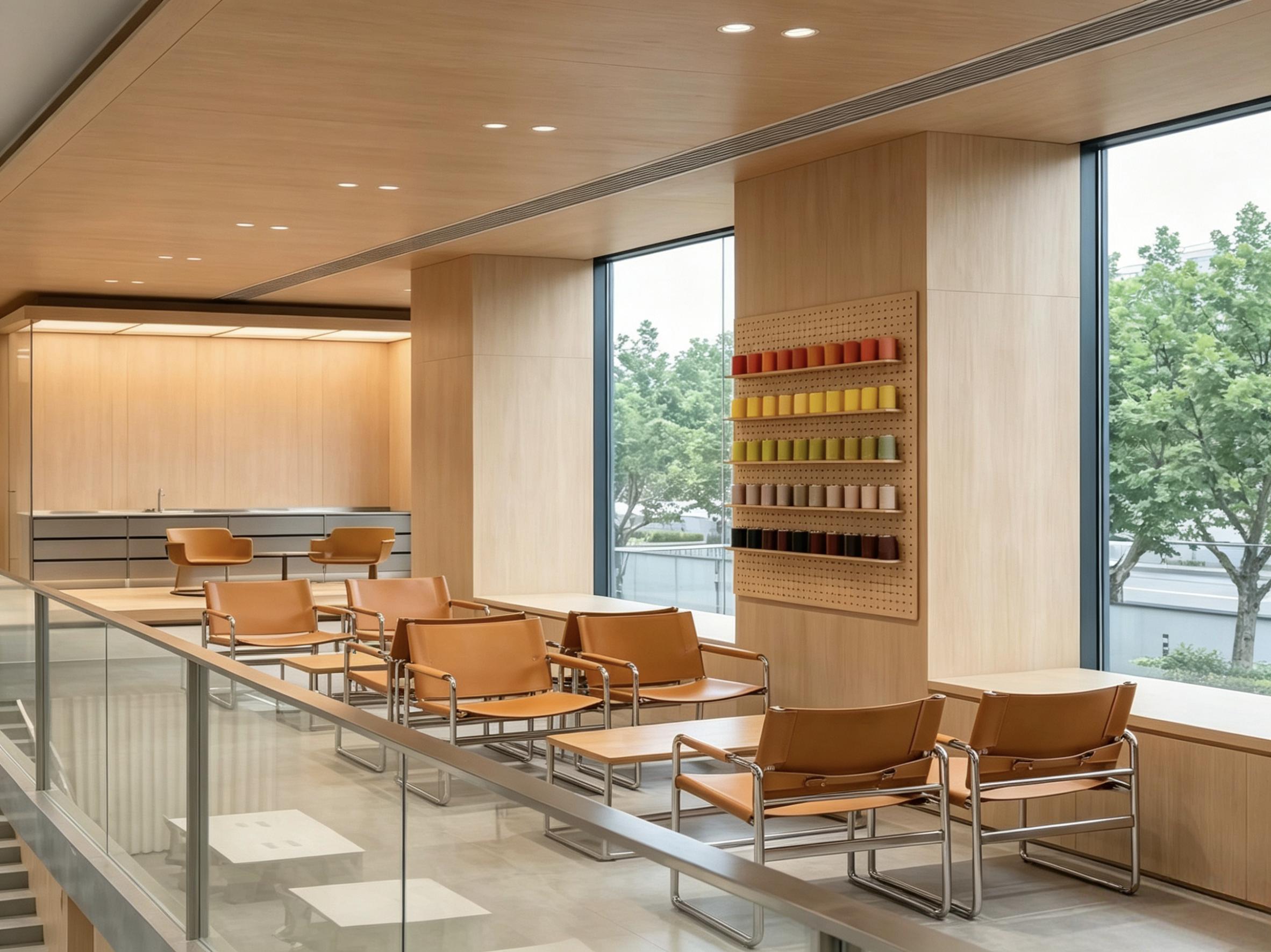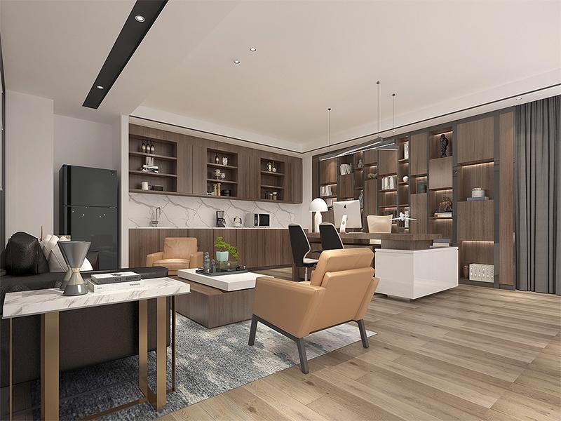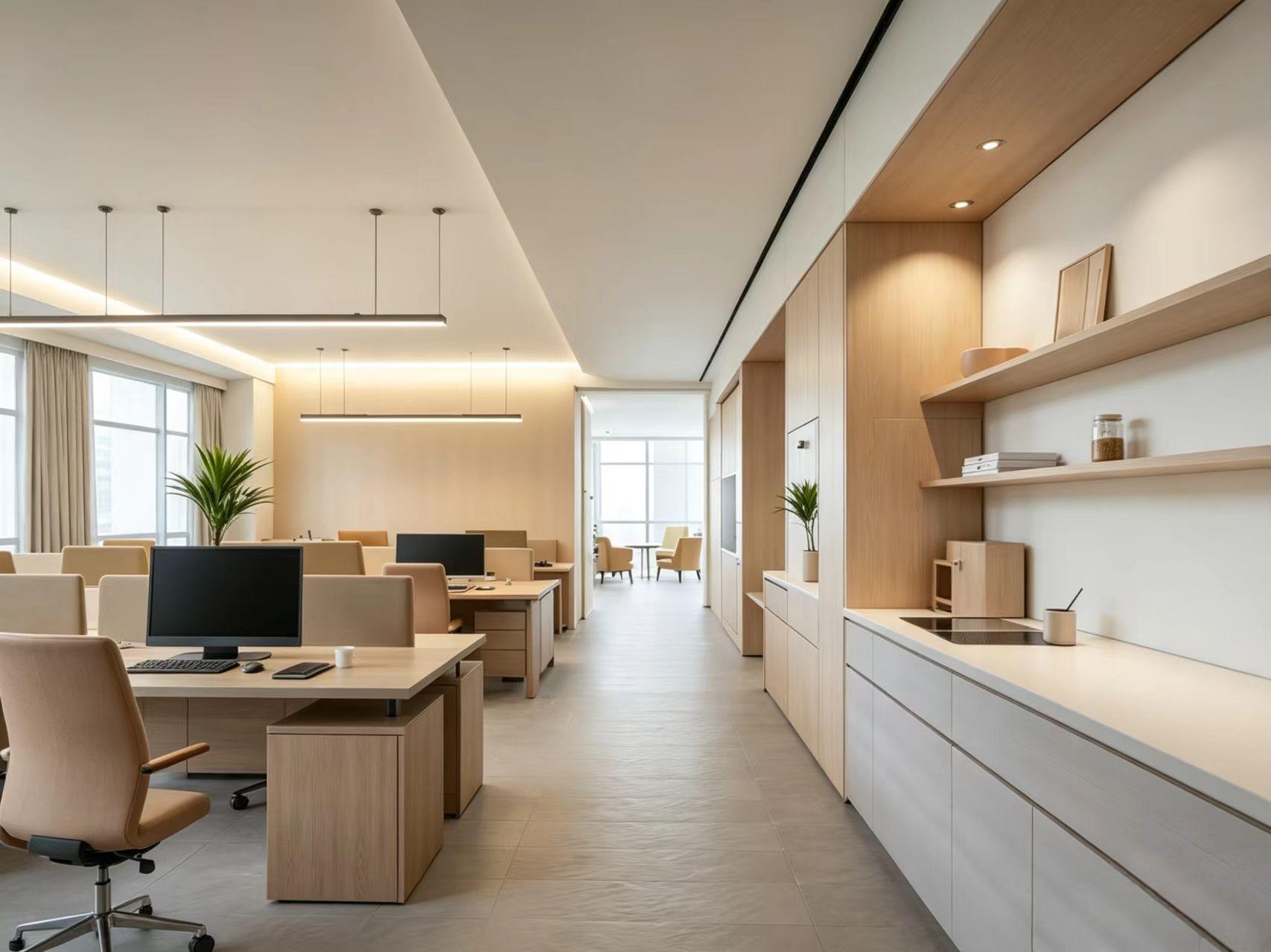 人工照明设计上,团队摒弃了传统单一的照明模式,根据不同办公区域的功能需求进行分层规划:开放办公区采用均匀的泛光照明,减少视觉疲劳;洽谈区搭配柔和的局部补光,营造舒适沟通氛围;会议室则选用防眩光灯具,避免光线反射影响会议体验。同时引入智能照明系统,可根据自然光强度动态调节亮度,实现节能降耗,也契合了绿色办公的设计理念。