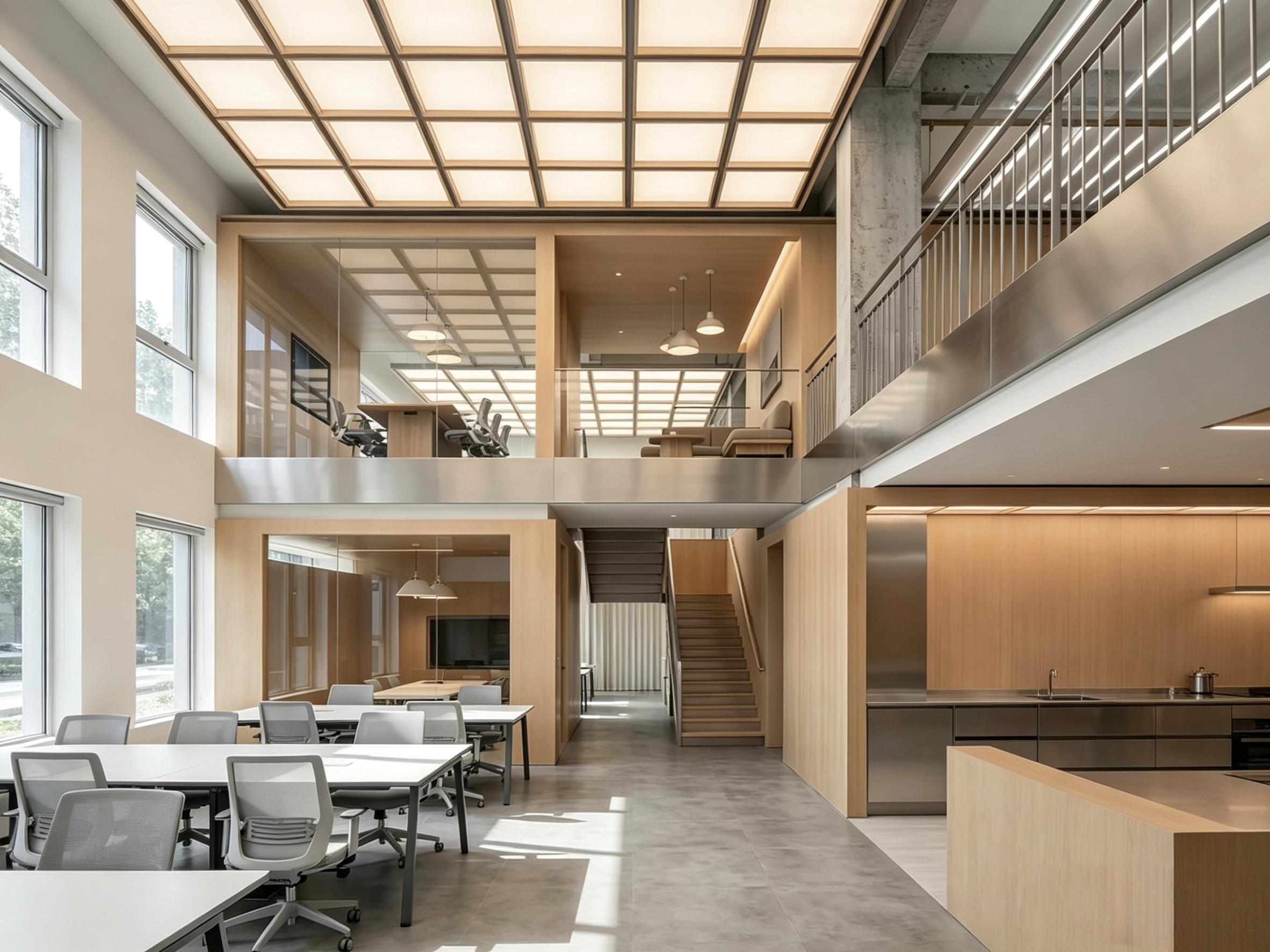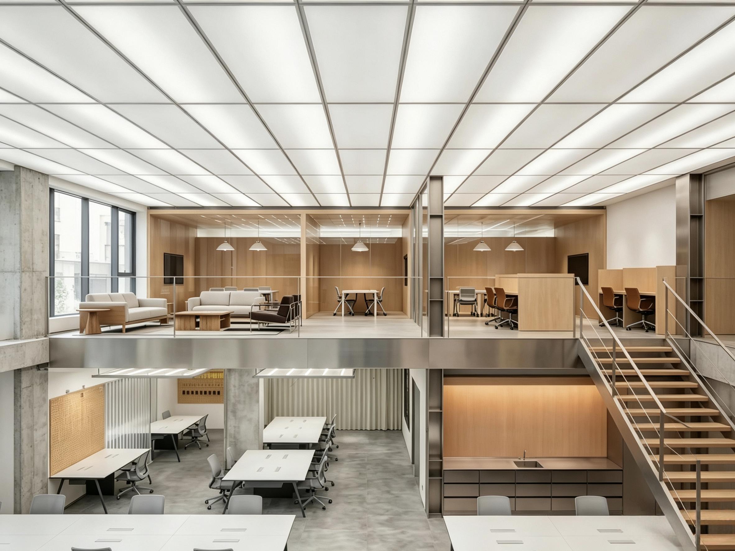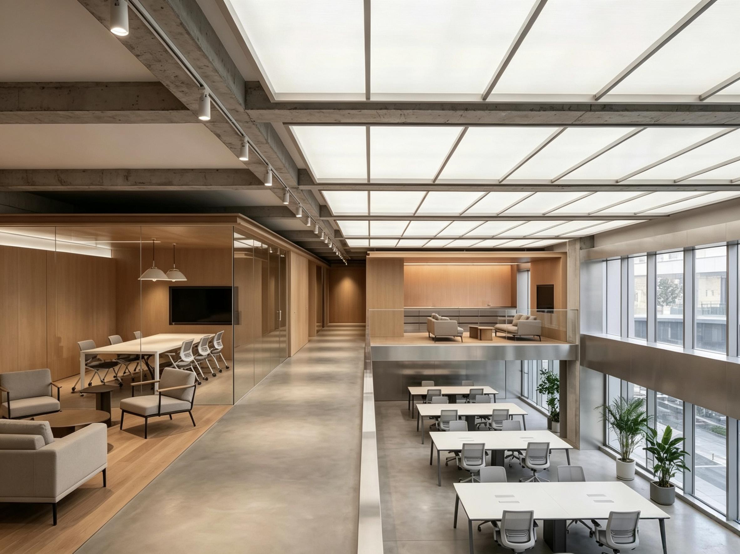 | 案例简介 | 四川壹西格玛建筑工程有限公司承接成都新都区 800 平厂房改造办公室项目,针对原厂房采光不足问题,以自然光引入与分层照明设计为核心,通过落地窗、天窗、智能照明系统等优化手段,打造了明亮通透、高效舒适的办公空间,解决了厂房改造的采光痛点,为企业提升办公效率提供了优质环境。 |
