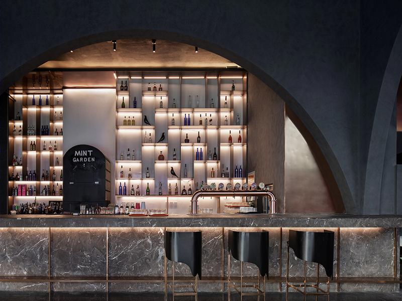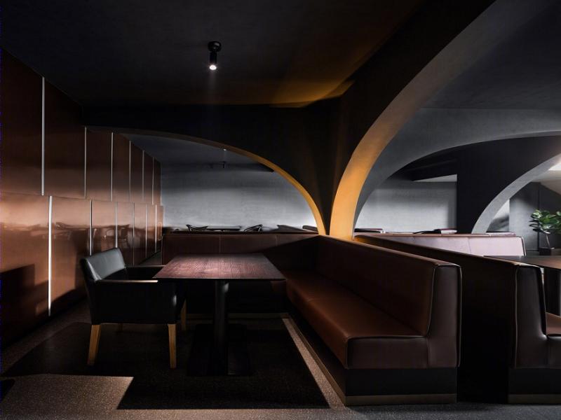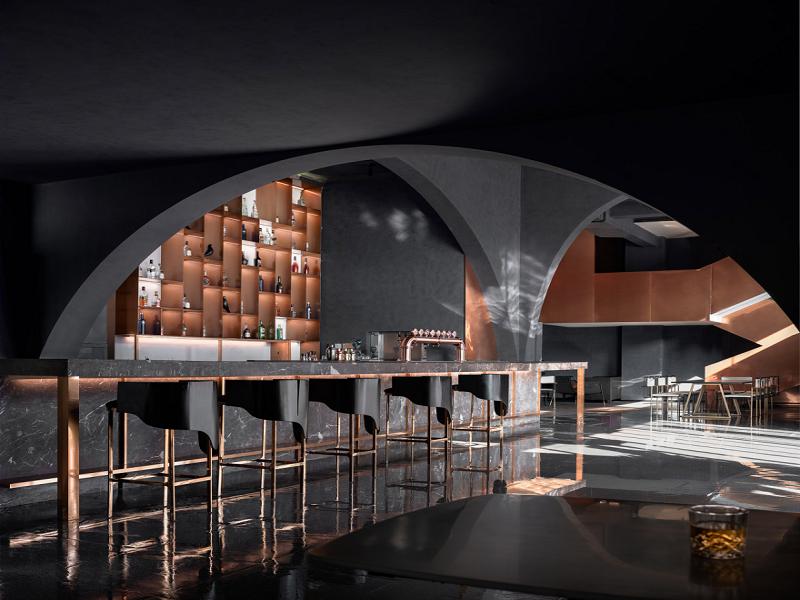 原场地为一栋两层独栋建筑,一层层高5m,二层层高4.2m,酒吧布置在一层。明确功能后,我们将厨房、卫生间、办公室、独立闹吧、包房等封闭空间视为实体,穿插在整体空间之中。部分区域打通现有楼板,形成局部的三层空间