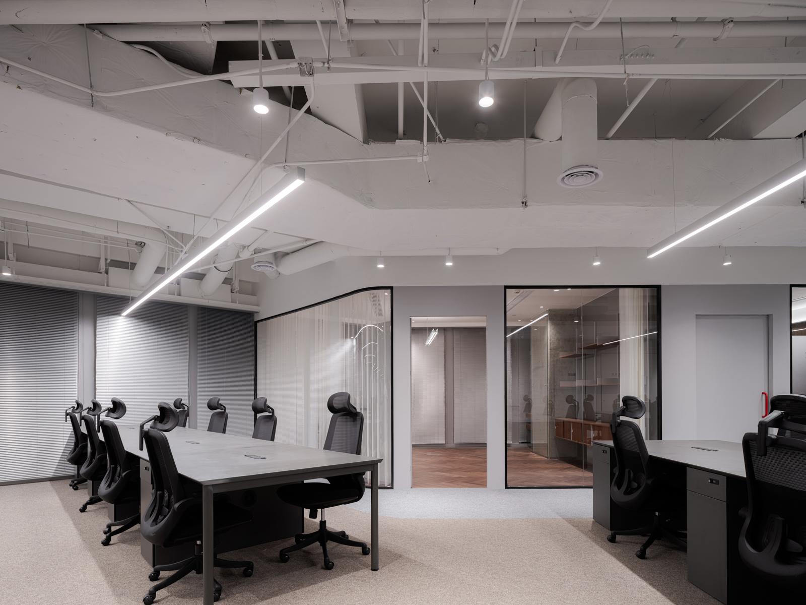内部装饰以工业元素为主,墙面保留了部分裸露的砖墙,地面则采用了耐磨的水泥地坪。天花板上裸露的管道和电线以有序的方式排列,成为空间的一种装饰。办公区域的设计强调开放与协作,采用开放式布局和灵活的隔断,既方便员工之间的沟通与交流,又保持了各自的独立空间。