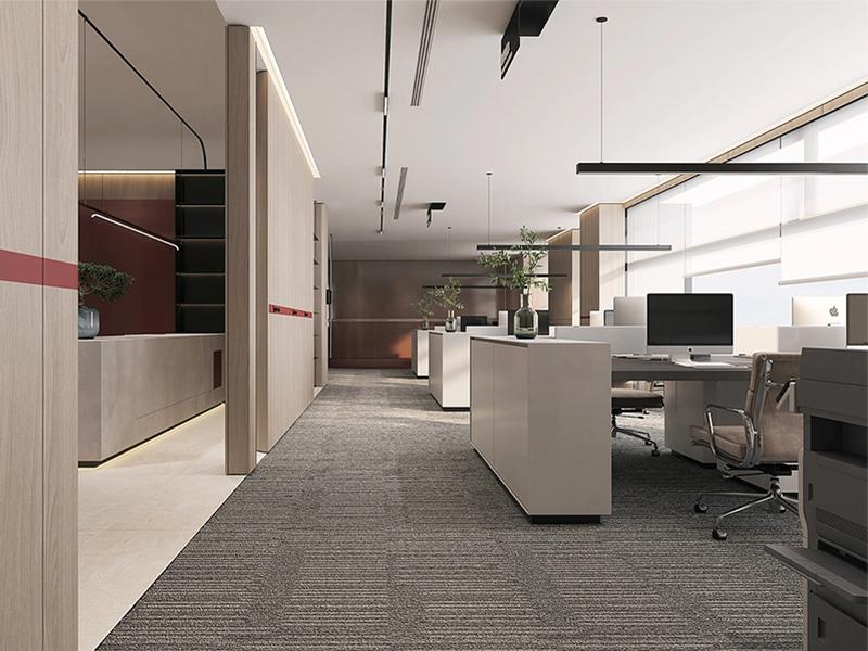 与顶面和墙面的白色形成鲜明对比的是地面上铺设的800*800灰色地砖。这种灰色地砖不仅具有耐磨、防滑的实用性能,其深沉而稳重的色调也为整个空间增添了一份沉稳与大气。灰色的地砖与白色的顶面和墙面相互映衬,形成了一种简洁而富有层次感的视觉效果,使整个办公室的空间感得到了进一步的提升。
