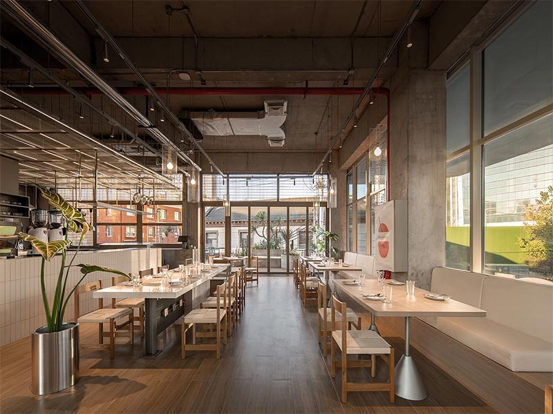 家具选择上,简约的黑色金属桌椅搭配原木元素,既节省成本又增添了一丝自然气息。吧台区域采用不锈钢材质,与工业风格相得益彰,同时也便于清洁。