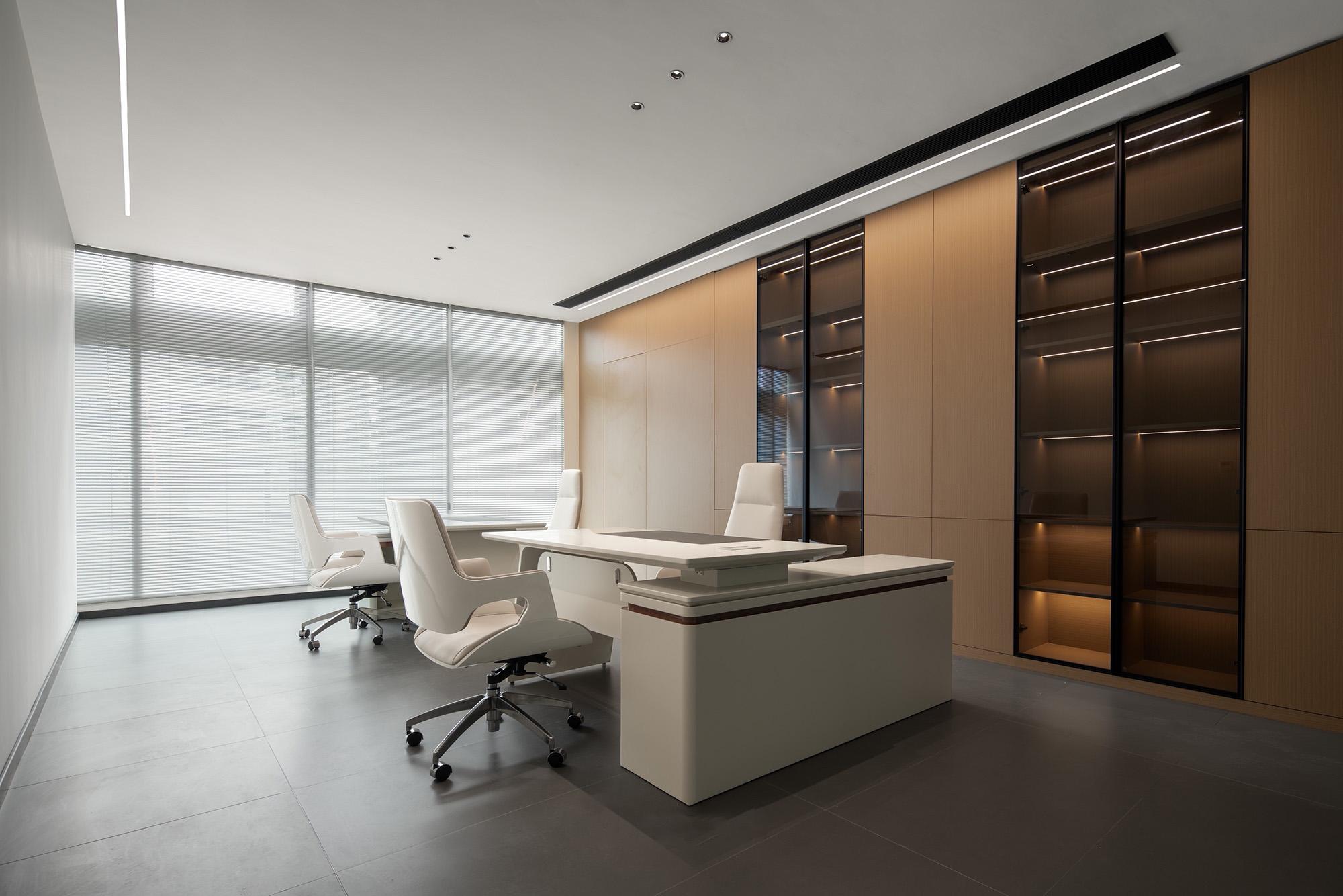 总经理办公室则不拘泥于其他场域的造境原则。室内采用以中性色调为主的色彩搭配,营造出一种沉稳、大气的氛围。在这里,总经理可以在舒适的环境中高效地处理工作事务,同时也能够享受到独特的美学氛围带来的愉悦感受。