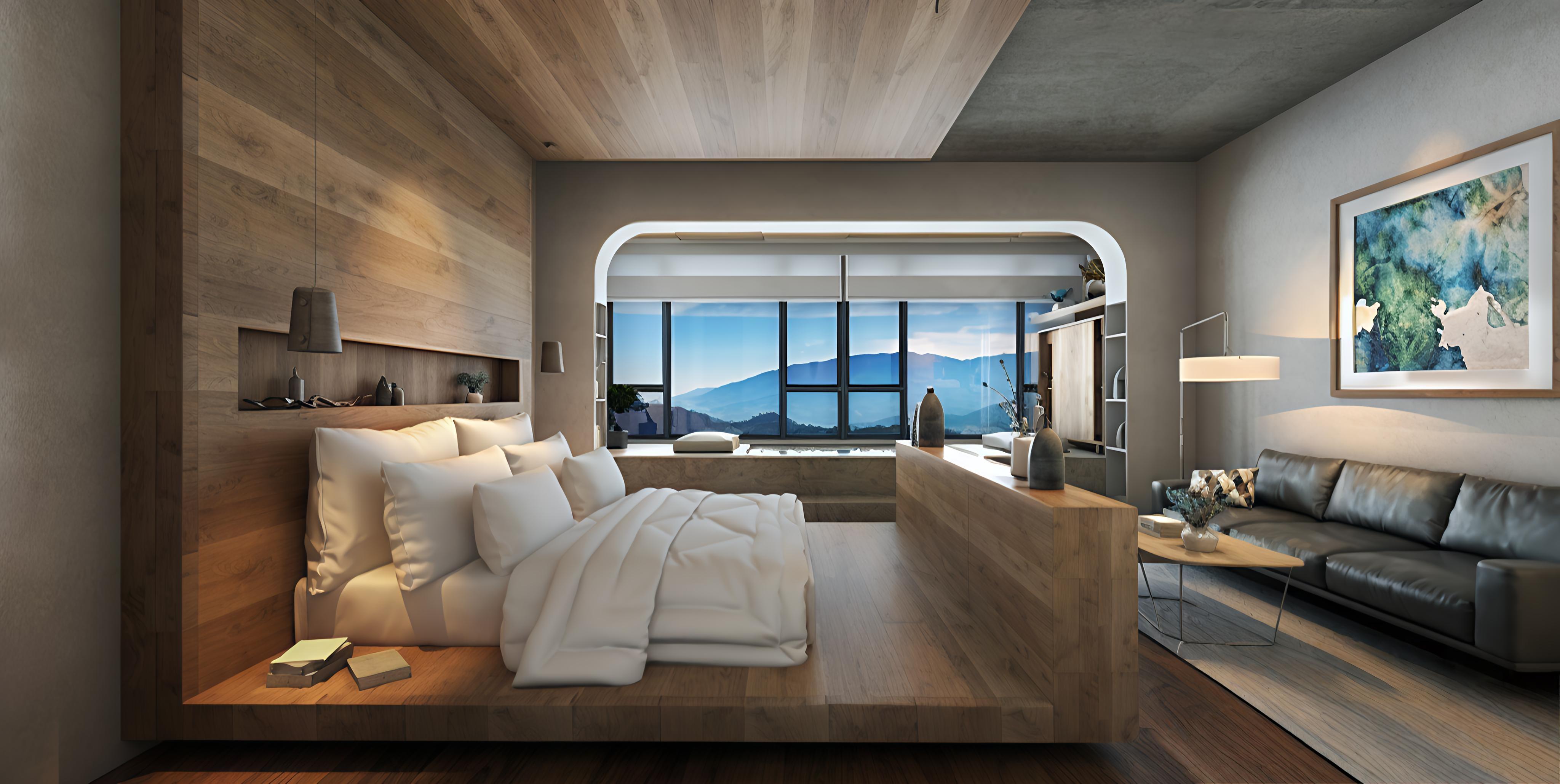 走进其中一间卧室,更是别有洞天。这里融合了自然元素与极致的舒适感。大面积的落地窗如同画框,将远处连绵的山峦框成一幅绝美的风景画,让阳光肆意倾洒,采光极佳。左侧的室内小型泳池,在波光粼粼中散发着独特魅力,池边米色坐垫柔软舒适,装饰性的花瓶中插着枝条,营造出一种悠闲惬意的度假氛围。木质衣柜与开放式书架紧邻泳池,书架上琳琅满目的书籍与精致摆件,彰显着主人的文化品味,而衣柜上方的漂流木和绿植,更是将自然风发挥到了极致。右侧的大床铺着洁白的床品,床头上方的鹿头装饰别具一格,旁边木质搁板上的书籍与装饰瓶,搭配垂吊的简约灯具,温馨且富有格调。整个空间以米色、木色为主色调,自然材质与独特装饰相得益彰,打造出了一个宁静而极具质感的休憩空间,让人仿佛置身于世外桃源