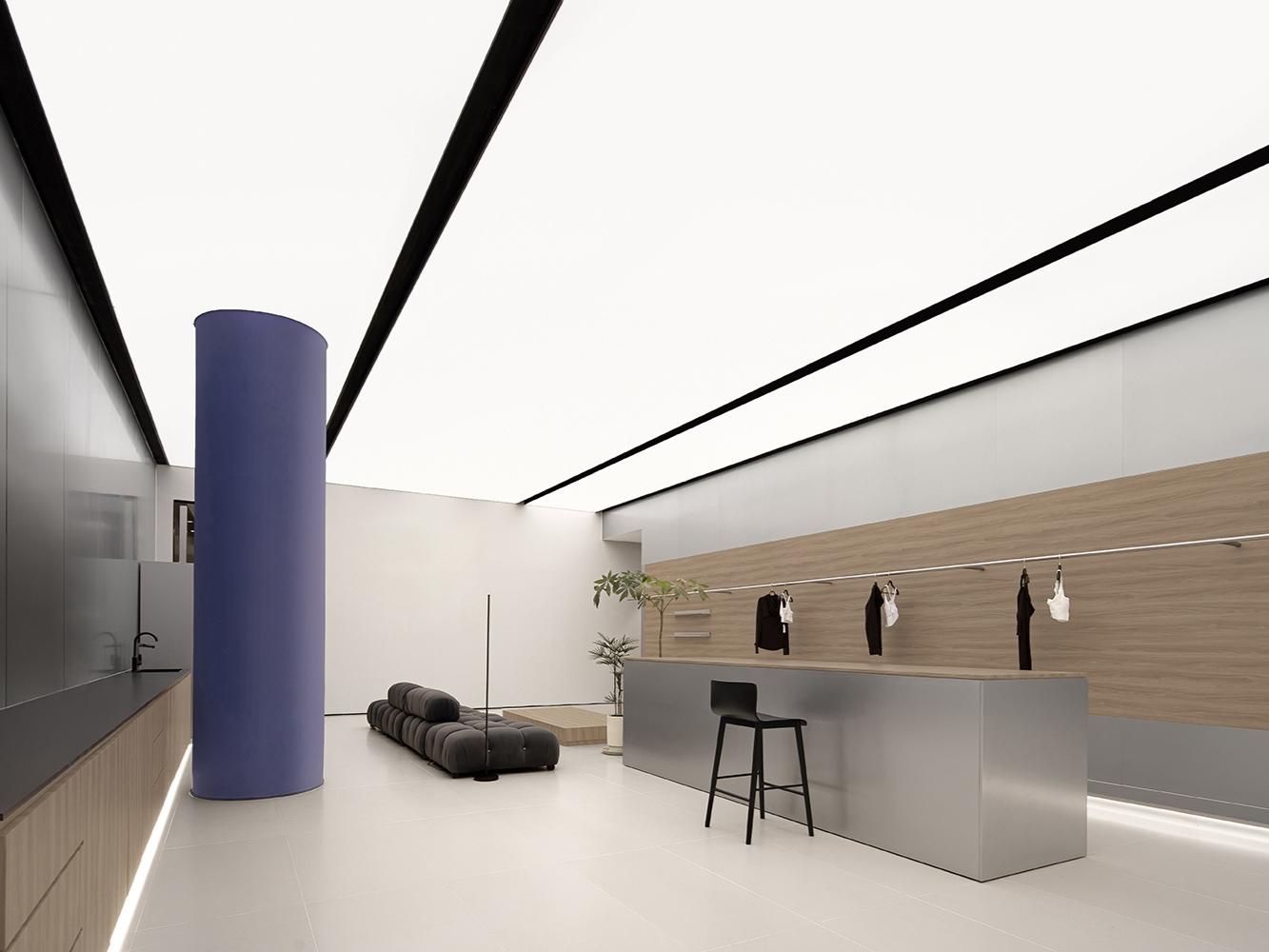 再看休息区域,设计同样独具匠心。一座金属打造的吧台散发着冷峻的气息,与旁边温暖的木质墙面形成鲜明对比。木质墙面上挂着几件柔软的运动披肩,方便会员在运动后随手披上,细节之处尽显贴心。吧台边,黑色的高脚凳静静伫立,线条简洁流畅,实用且美观,让人可以轻松惬意地坐下休憩。地面铺着洁净的白色地砖,与整个空间的明亮氛围相得益彰。在区域中央,一根醒目的紫色大柱子成为视觉焦点,它的独特色彩打破了空间的单调感。柱子旁边,一组舒适的沙发围合摆放,为会员们提供了一个温馨、放松的休息角落,让大家能在高强度的训练后充分舒缓身心。