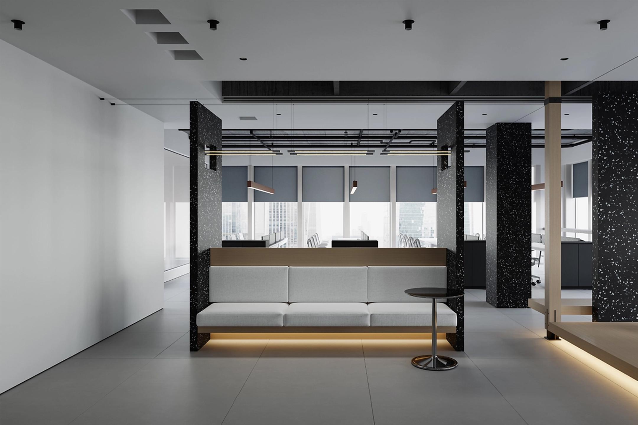 穿过开放式办公区,来到休闲交流区域。这里是员工放松身心、激发创意的角落。黑色带白色斑点的立柱与隔断,巧妙划分出相对独立的空间,既保证了整体的通透感,又赋予了领域感。浅灰色的三人沙发,搭配简约的圆形金属边桌,为员工提供了舒适的休息场所。沙发底部隐藏的灯带,在夜晚亮起时,营造出温馨而惬意的氛围。在这里,员工可以短暂休憩,也能进行轻松的交流讨论,碰撞出创意的火花。