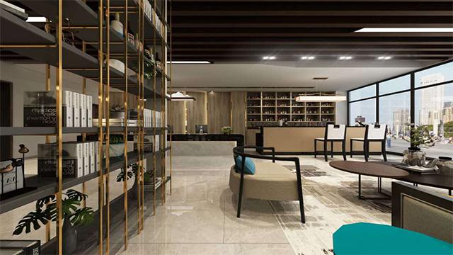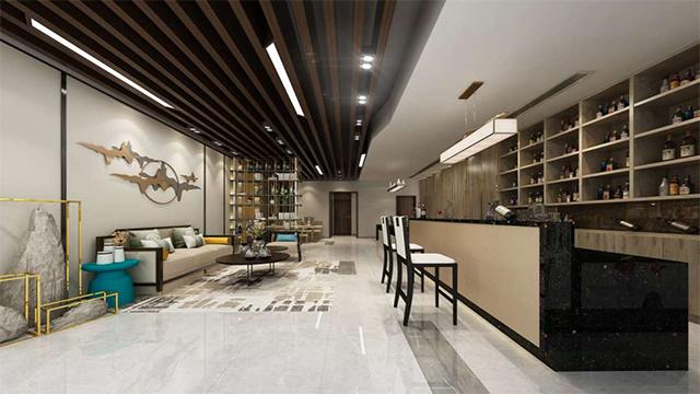 第二,休闲吧区的场景与运营逻辑。吧台区不只是提供饮品的空间,更是酒店的“第二客厅”。设计的核心是平衡氛围与实用性:开放式的置物架既可以作为装饰展示,也能满足后期的运营陈列需求;休闲座椅的布局要兼顾私密性与互动性,地面材质选择耐磨易清洁的瓷砖,同时通过软装搭配提升空间的松弛感,让客人愿意停留,也为酒店创造更多消费场景。