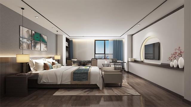 第五,套房客房的功能与体验逻辑。套房设计需要兼顾商务与休闲双重需求,实现空间的合理分区。卧室与会客区通过隔断自然划分,既保证了休息区的私密性,也为商务客人提供了办公、会客的空间;床头背景墙的装饰与灯光设计,提升了空间的质感,同时通过合理的家具布局,避免空间拥挤,让套房既有商务的专业感,也有家的松弛感。