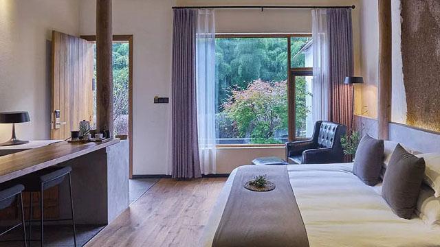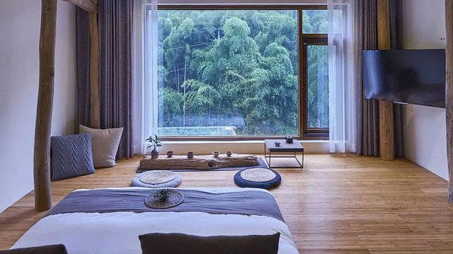项目以 “禅意为骨,舒适为肤”,实现了两者的深度融合。在客房设计中,大面积全景落地窗是平衡的关键 —— 它既将窗外竹海的四季景致引入室内,以 “借景造境” 的手法营造东方禅意的悠远意境,又最大化引入自然光,让室内空间通透开阔,契合现代人对明亮、开阔居住环境的需求。临窗而设的圆形浴缸,被碎石与绿植环绕,泡澡时可直面整片竹林,实现了禅意疗愈与现代卫浴舒适体验的结合;而温润的原木地板搭配棉麻软装,在传递自然质朴禅意的同时,也保证了赤脚行走的温暖触感,让禅意不再是 “远观的意境”,而是触手可及的舒适。