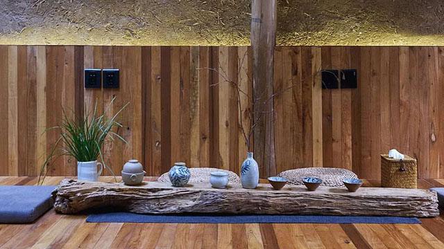 在材质与细节的把控上,项目拒绝了传统禅意的 “苦行感”。夯土墙面带着自然肌理,搭配暖光灯带的柔光晕染,营造出沉静的禅意氛围,而墙面下的隐藏式插座、全屋隔音设计,则悄悄解决了现代居住的实用痛点;裸露的老木梁柱与竹编吊顶,保留了东方建筑的原生质感,而嵌入式筒灯、静音空调等设备的隐藏式安装,让现代科技不破坏空间的整体美感,实现了 “看不见的舒适,看得见的禅意”。