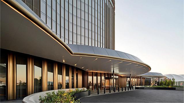 首先,建筑与外立面的设计是高端酒店的第一张名片。就像很多成都高端酒店的外立面设计,我们始终坚持 “在地性与高级感结合” 的原则,摒弃千篇一律的方正造型,以流畅的弧形线条、金属与玻璃的材质碰撞,打造兼具辨识度与质感的建筑立面。同时,我们会充分考虑成都本地的气候与城市风貌,让建筑不仅成为视觉焦点,更能与周边环境和谐共生,从入口动线到雨棚设计,每一处细节都兼顾了宾客体验与运营维护的便捷性,这也是成都装修设计公司区别于普通设计机构的核心优势之一。