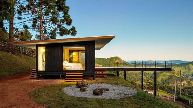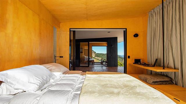 公装设计的实用性,是借景手法落地的前提。很多民宿的大玻璃窗设计,会面临保温、隐私、清洁等实际问题。这组项目中,公装团队采用了双层中空Low-E玻璃,既保证了观景的通透感,又解决了山地温差大、紫外线强的问题;同时搭配了隐藏式的窗帘轨道,白天收起时不影响观景,夜晚拉上又能保障住客隐私;悬挑平台的玻璃护栏,既保留了无遮挡的观景体验,又符合公装的安全规范。这些细节的处理,让借景设计不只是好看的“网红打卡点”,更是能长期运营、兼顾住客体验的实用空间。