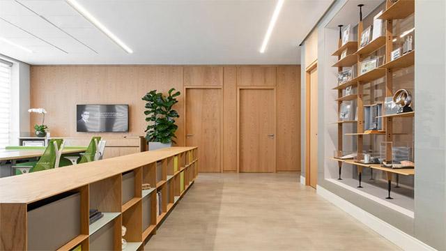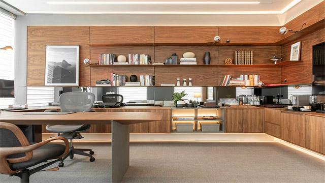第三是灯光与木饰面的适配设计。光线是放大木饰面质感的关键。不少企业的办公室,木饰面在顶光直射下会显得暗沉呆板,甚至暴露板材的瑕疵。我们在成都工装设计中,会为木饰面搭配嵌入式线性灯带或壁灯,通过漫反射光线烘托木材的纹理层次,避免强光直射。比如在木饰面书架下方嵌入感应灯带,既能照亮置物空间,又能让木材的温润感被充分放大,同时提升空间的温馨氛围,让员工在办公时也能感受到舒适的氛围。