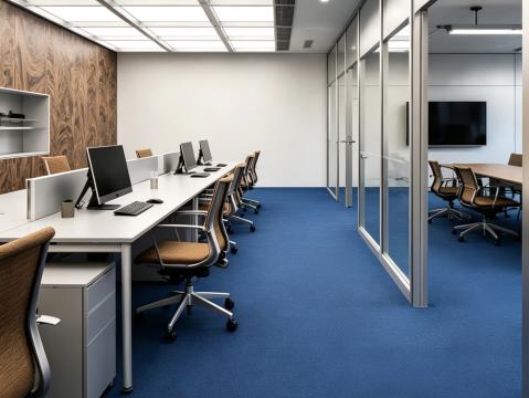 首先,色彩搭配是快速改变空间气质的关键。很多成都写字楼的原始户型采光有限,大面积的冷色调会让空间显得更压抑。我们在做成都工装时,会优先用低饱和度的暖调中和冷感,比如浅橡木色的护墙板、暖灰色的哑光地砖,搭配局部的莫兰迪色系软装,既不会破坏办公空间的专业感,又能弱化传统工装的冰冷感。开放式办公区可以用同色系的地毯划分区域,既吸音降噪,又能通过柔和的色彩打破大面积白墙的单调。