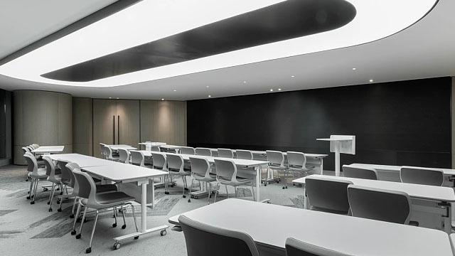 功能分区是高端办公设计的关键。项目将空间划分为总裁办公区、多功能会议室、培训室与休闲阅读区四大模块:培训室采用可移动桌椅与弧形柔光顶灯,灵活适配培训、路演等多种场景;休闲区则以整面开放式书架为核心,搭配大理石长桌与软包座椅,让员工在工作间隙能享受阅读与交流的静谧时光,实现高效工作与精神休憩的平衡。