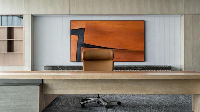 轻奢的核心在于 “轻而不浮,奢而不华”。项目中,设计师选用天然木饰面、大理石与细腻布艺作为主要材质:总裁办公室以浅木色办公桌搭配深棕皮质座椅,背景墙的暖橙抽象画与浅灰木柜形成视觉对比,既保留了商务空间的沉稳威严,又通过艺术软装弱化了距离感;会议室则以大花白大理石背景墙为视觉焦点,搭配浅灰布艺沙发与黑色皮质会议椅,在通透落地窗的自然光映衬下,营造出庄重而不失松弛的洽谈氛围。
