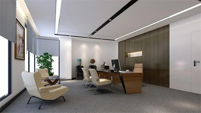 其次是光线与色彩失衡:过度依赖人工照明、墙面色调暗沉,会让空间显得冰冷压抑。反观合理设计的办公室,会通过落地窗引入自然光,搭配浅白墙面与暖木色家具,再用绿植点缀柔化氛围;总裁办公室则以柔和线性灯与木饰面柜体,营造沉稳而不压抑的商务氛围,让光线与色彩共同调节情绪。